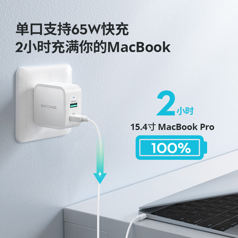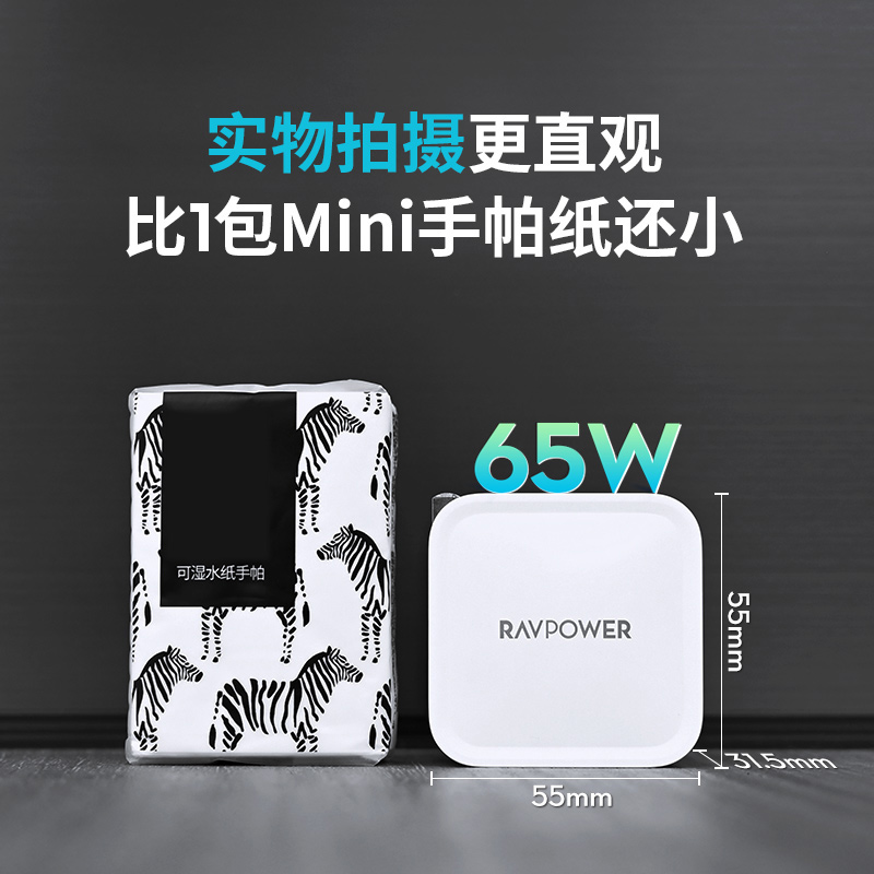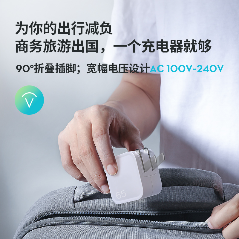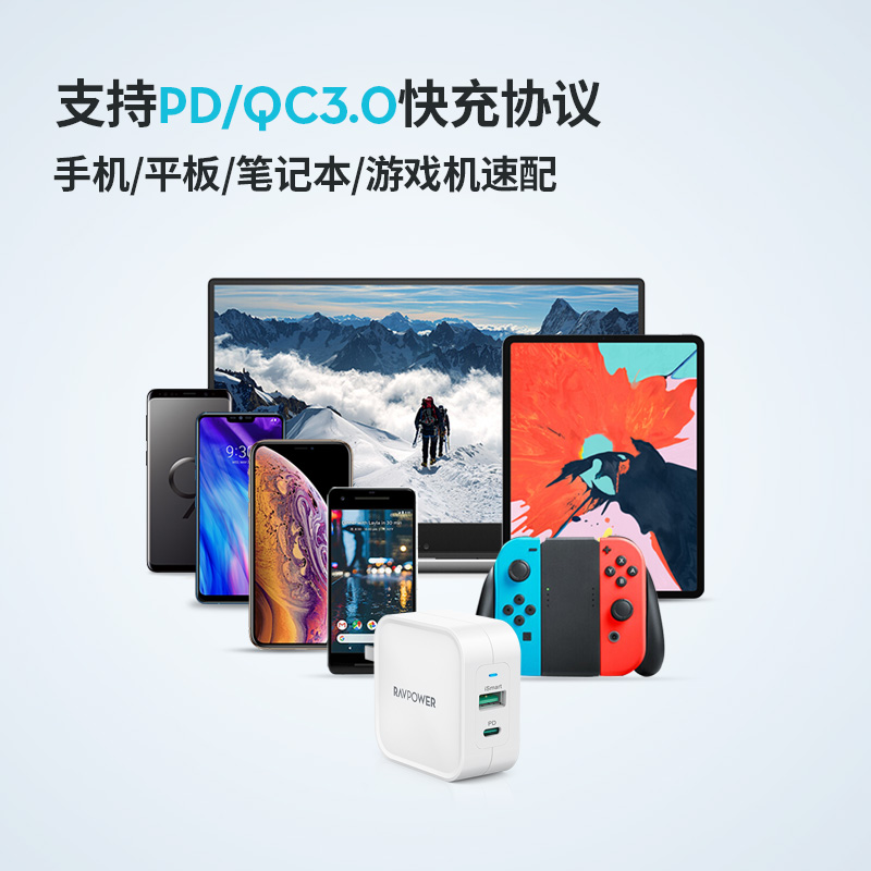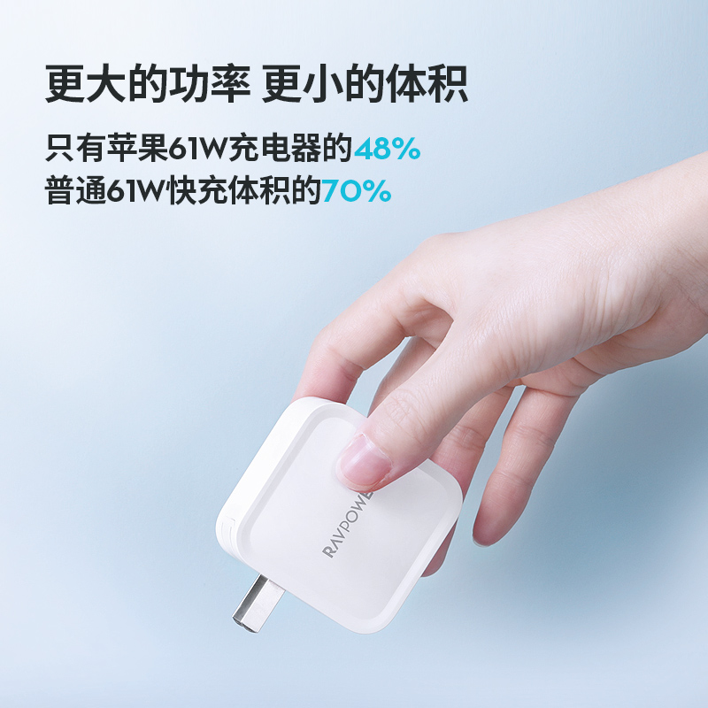该款充电器采用GaN氮化镓作技术,拥有强力导热效率和耐高温优势,提升充电效率的同时还能够缩小体积,仅有苹果原装61W充电器的48%大小。配备1个Type-C和1个USB接口,支持PD协议的全系Apple产品,兼容QC3.0,支持笔记本和手机双口快充,Type-C口保持45W-60W,USB口保持5W-18W。内置iSmart芯片,自动匹配设备电压,不怕伤设备。配备折叠插脚,更易收纳,三围55*55*31.5mm,重120克。