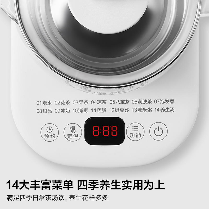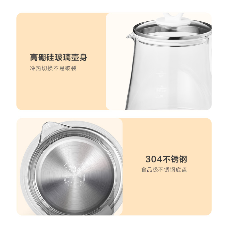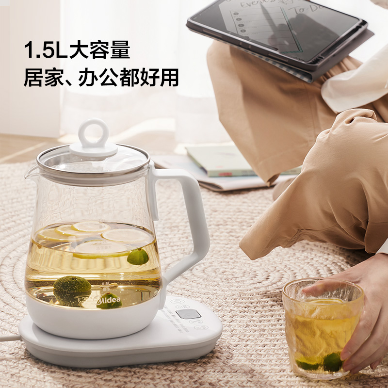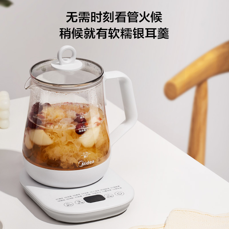 Midea 美的 MK-Y12Q 养生壶 白色 1.5L,搭载智能变频技术,在文武火之间智能切换;还有智能预约保温功能,到点自动运行,半小时后即可享用,简单又省心;壶身采用高硼硅剥离材质,冷热切换不易破裂。