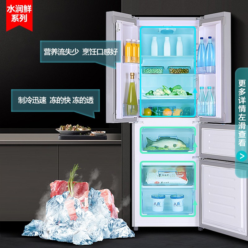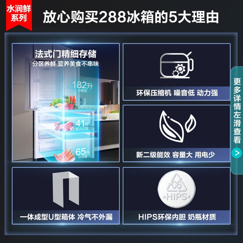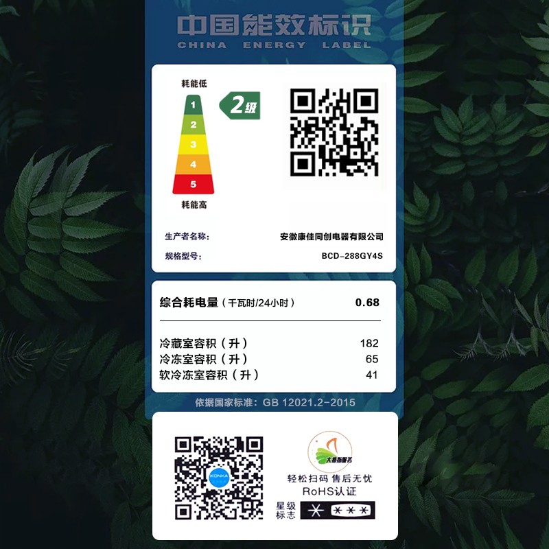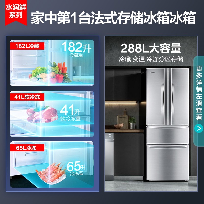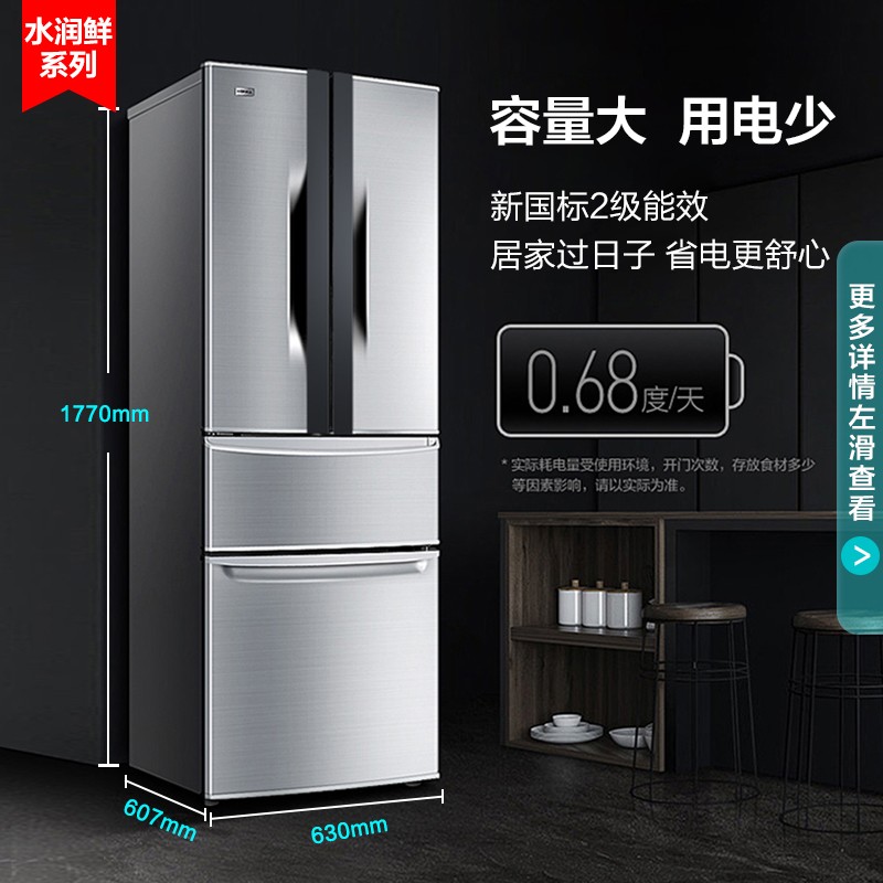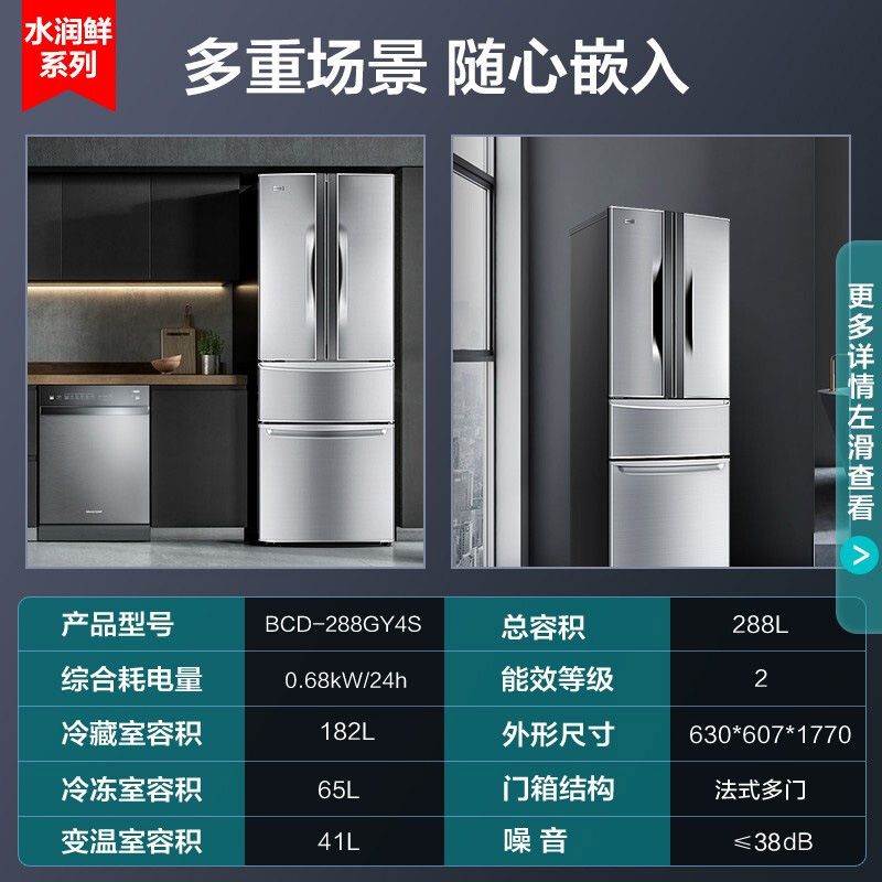 康佳(KONKA)这款型号为BCD-288GY4S的多门冰箱,288L大容量,其中冷藏室182L,软冻室41L,冷冻室65L。中门软冷冻适合放置生鲜肉类,家禽肉类即取即切。冰箱整体外部采用不锈钢面板,门条可拆卸清洁,各温区食物分门别类存放,左右门共7个搁架,门把手采用隐藏式设计。此款为定频,能效等级二级,产品尺寸为607*630*1770mm(深x宽x高)。