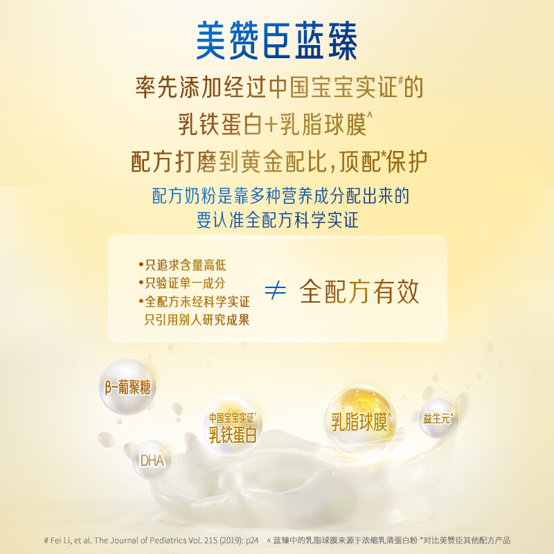 对比美赞臣其他款奶粉,这款蓝臻第二代幼儿配方奶粉添加95%高纯度、具活性的乳铁蛋白,贴合宝宝营养需求,为宝宝的健康成长保驾护航。含有独特的短链+长链独特益生元组合,能够全面保护宝宝的肠道,呵护宝宝肚肚。乳铁蛋白与长链独特益生元相互结合可激活乳脂球膜源乳营养群,这一营养群内含有200多种源乳营养、5种脑磷脂、90%原乳蛋白种类以及免疫功能蛋白群,可促进宝宝的智力和视力发展,帮助大脑发育,提高宝宝认知能力和增强宝宝抵抗力。