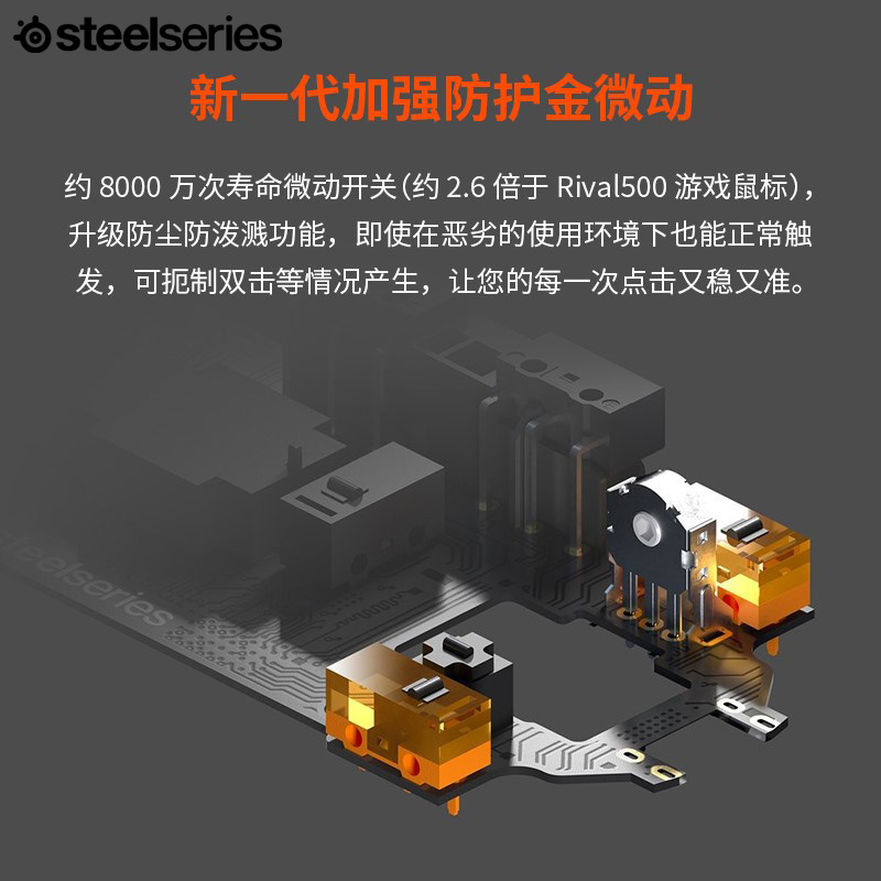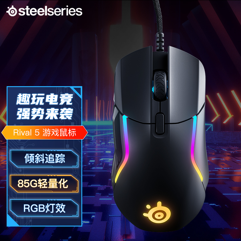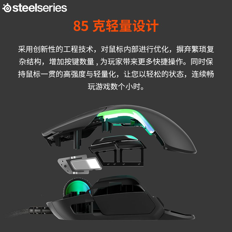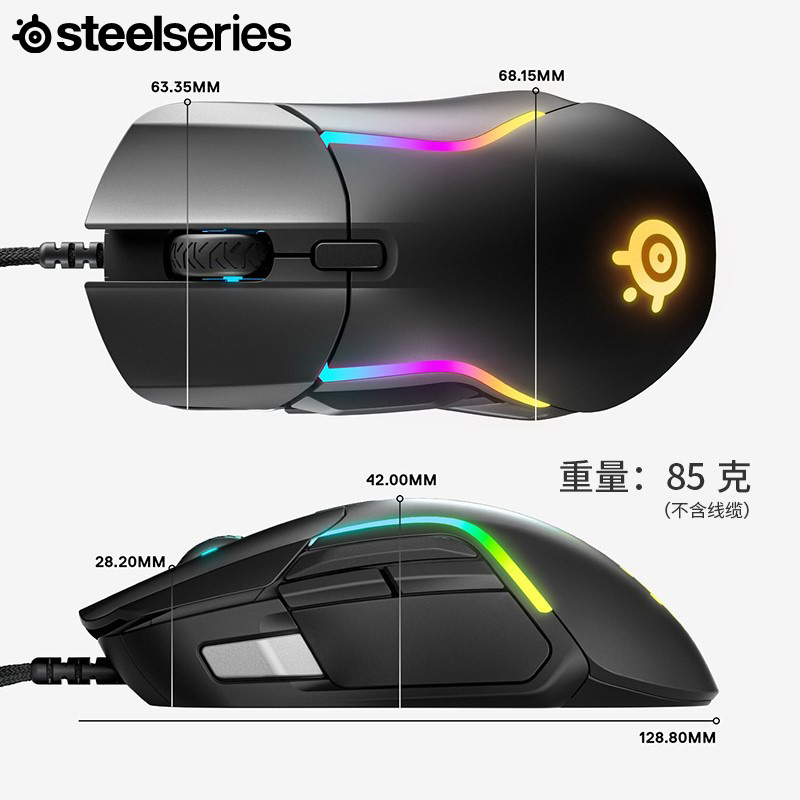 Rival 5 配置 9 个可编程按键,每个按键都具备自定义功能,鼠标左侧裙设计 5 枚快捷按键,玩家可根据游戏类别合理分配可设置按键,能够降低游戏操作负荷,同时不会对鼠标定位准确度及移动性造成负面影响。另外,这次与 PixArt 联合研发,真1:1追踪,采样率高达 18000CPI ,可承受 400IPS 移动速度和 40G 加速度。Rival 5 采用创新性的工程技术,85克轻量化设计,对鼠标内部进行优化。