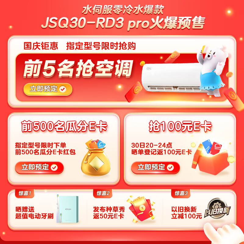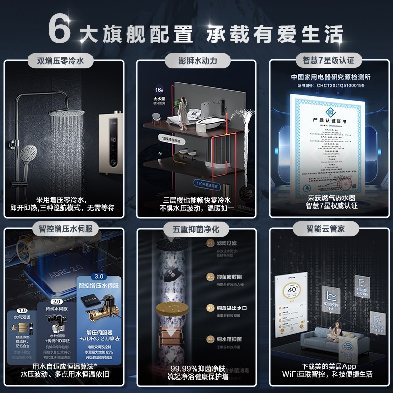 美的这款JSQ30-RD3 pro燃气热水器,搭载了5800转/分的自动增压泵和沐浴增压洗,可以实现巡航+洗浴双驱增压效果,增压零冷水技术通过提前巡航加热管内水流,达到即开即热的目的,三种巡航模式,能满足不同的用水需求,高达三层楼也能畅快地享用零冷水。同时搭载增压伺服器,ADRC2.0恒温算法可以动态调整精控恒温,将水温波动保持在体感舒适温度范围内,根据用水情况,还能智能匹配、分段燃烧,更加节能。有5重净浴,能99.99%抑菌净肤,且荣获燃气热水器智慧7星级认证,支持手机APP智能控制,以及智能开机自检,有6大安防保障使用安全。