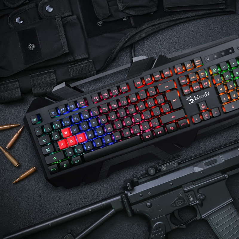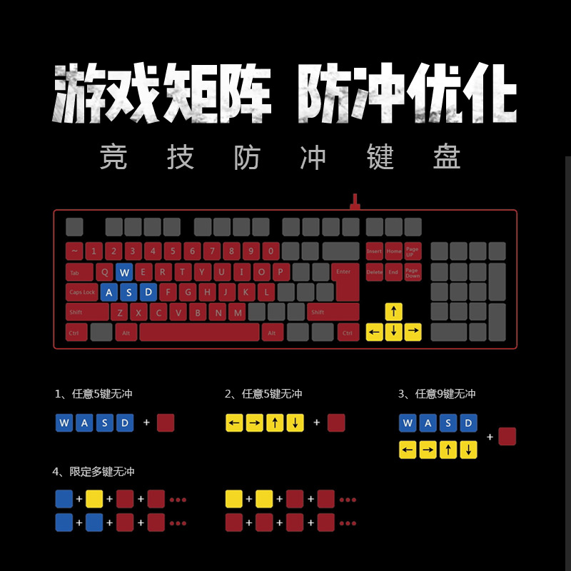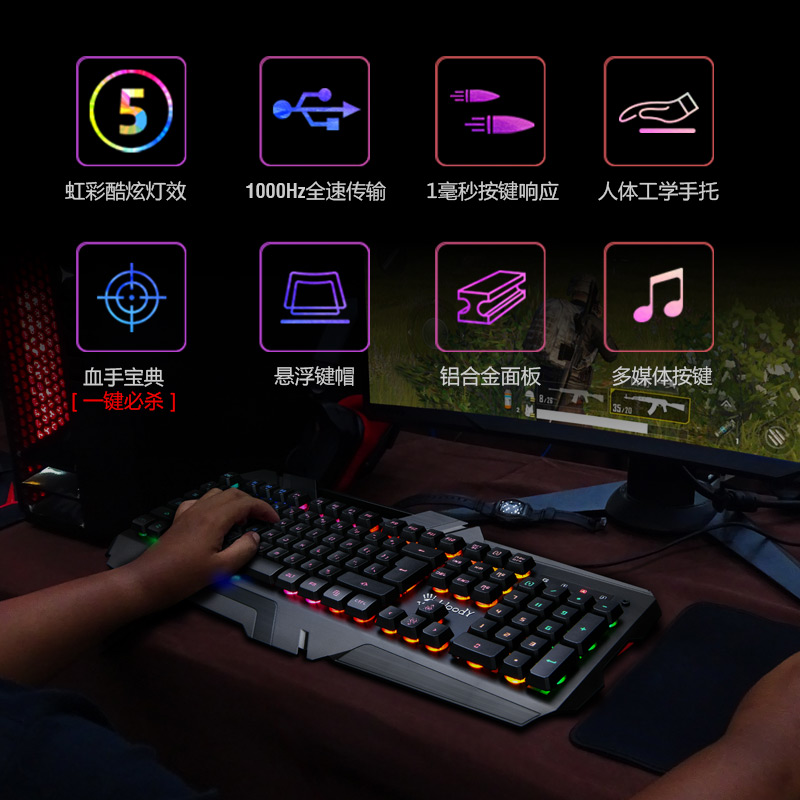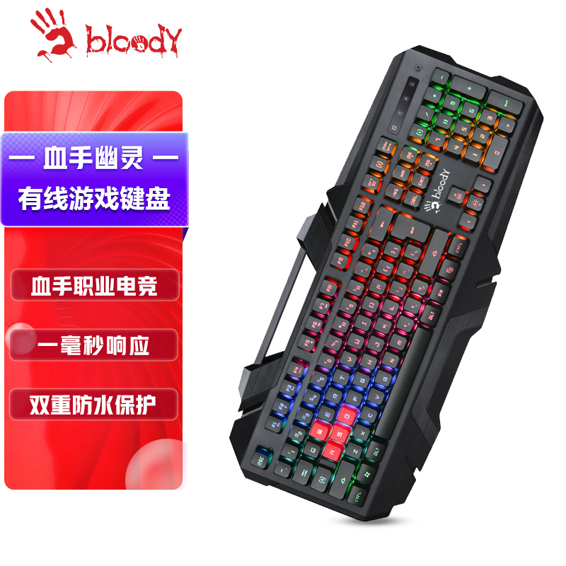 B150N血手幽灵键盘自研虹彩五路光控技术,将漣盘背光五区7色排布,配台灯效延时的加持,交替闪烁的七种颜色灯酷似RGB的灯效。采用PCB+LED新型发光设计,经104颗LED直射透光到每颗按澀,因光路短及无掼直射,键帽字体透光均匀,整体明亮度一致。双重防水保护,1毫秒按键响应,多媒体控制键,人体工学扶手。