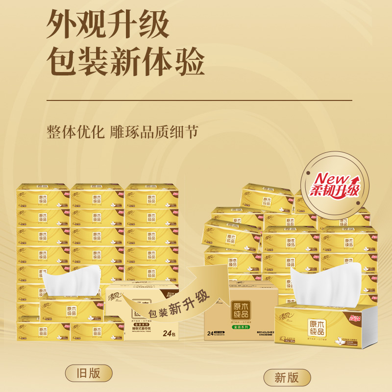 清风原木金装软抽,厚韧平衡,湿水不易破,换新登场,柔韧升级,品质呵护,是清风的王牌产品。 3层柔韧细滑,厚实与柔软的平衡体验,触感柔滑细腻;长短纤维交织工艺,纸质强韧,吸水力强;原生木浆,原料绿色更纯粹。 清风原木金装软抽,舒享品质生活。