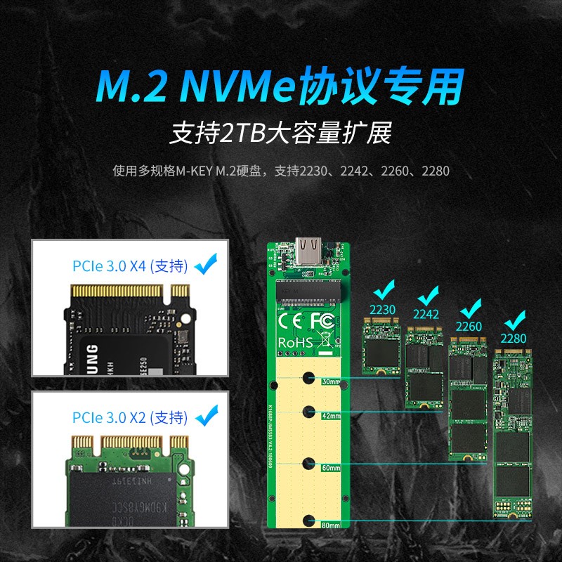 麦沃 K1688P M.2固态硬盘盒,支持2230、2242、2260、2280mm尺寸硬盘,NVME协议,Type-C接口,自带C2C数据线,支持10Gbps传输,104.5mm*31mm*9.5mm,精巧方便便携。