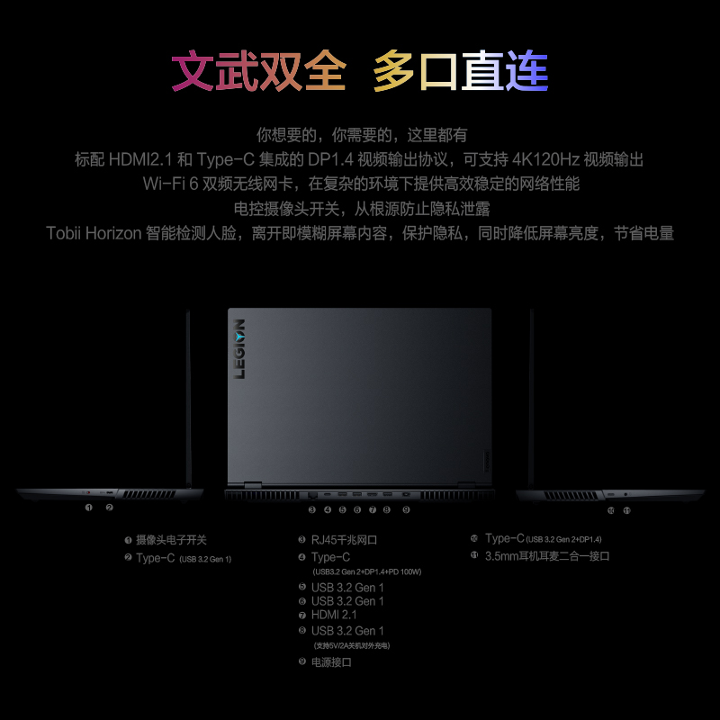 其他方面,R9000K 2021款搭载了第三代霜刃Ultra散热系统,全区超大面积VC液冷均热板,多区石墨烯辅助均热,让热量无处可藏,为新一代平台保驾护航;84mm大直径涡轮风扇配合全区进出风设计,散热效率更高。搭载全新的WiFi6标准双频无线网卡,最高速度可达2.4Gbps,2.4倍于千兆有线网络,完整支持MU-MIMO与OFDMA技术。80Wh大容量电池,配备300W高功率适配器,30分钟充满50%,一小时即可充至80%以上,且支持100W PD充电。搭载两个Harman超线性扬声器,Nahimic提供身临其境的听觉体验。接口方面,3*USB-A 3.2 Gen 1,2*USB-C(DP1.4、USB 3.2 Gen2,尾部C口支持PD),1*USB-C 3.2 Gen1,千兆RJ45接口,3.5mm音频接口,1*HDMI 2.1接口。