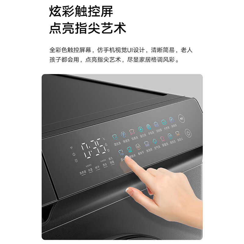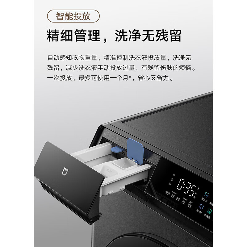 米家 XHQG100MJ102S 洗烘一体机,搭载直驱变频电机,动力更强劲、控制精度更高,提升洗净率,能实现真丝柔洗。内置智能投放,自动感知衣物重量,精准控制洗衣液投放,减少漂洗残留。蒸汽除菌功能,高温蒸汽渗透衣物纤维,除菌率达99.999%、除病毒(H1N1甲流)99.99%,支持高温除螨洗,除螨率达100%。ID设计上,米家洗烘一体机彩屏智屏版采用钛金灰配色,面板采用全彩色触控屏幕,仿手机视觉UI设计,面板还拥有32°黄金视角,避免操作弯腰。