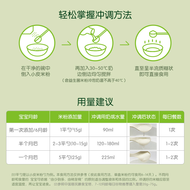 小皮是由Buck家族创办的英国有机婴童食品品牌,于2015年进入中国,产品包括辅食泥、婴幼儿高铁米粉、婴幼儿面条 、零食等,全线产品均由欧洲原装进口,专业营养搭配,拒绝多余添加。这款有机米粉选用意大利·波河三角洲有机大米原料,安全健康,远离重金属,根据不同宝宝月龄添加多种食材,粉质细腻易冲泡,口感细腻滑润,宝宝好吞咽,配方中添加更易吸收的二价铁Fe2+,提高了铁的吸收率,不添加植物油、白砂糖、淀粉、果糖,不给宝宝肠胃增加多余负担。