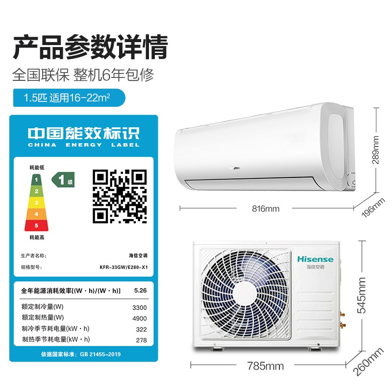 这款型号为KFR-33GW/E280-X1 属于海信舒适家系列,1.5匹新一级能效。800m3/h大风量速冷暖,额定制冷量3300W,额定制热量4900W,能效高达5.26,一键不直吹,第五代抑菌自清洁,抑菌率高达99.99%,智慧家庭控制,一机在手全屋可控,易拆洗滤网,16分贝轻音静享好眠到天亮。