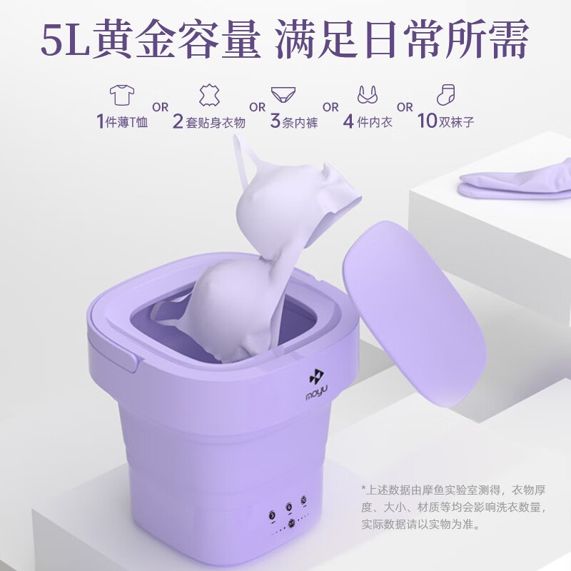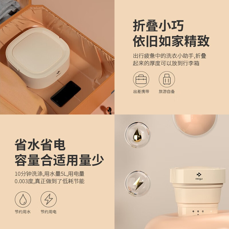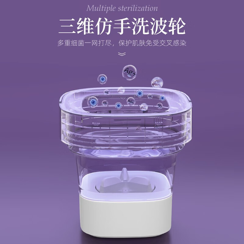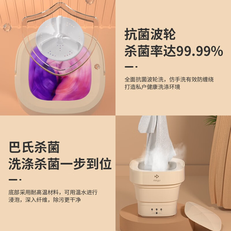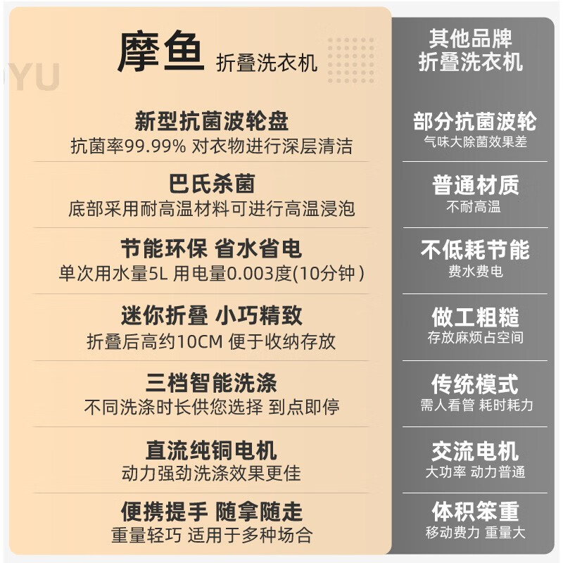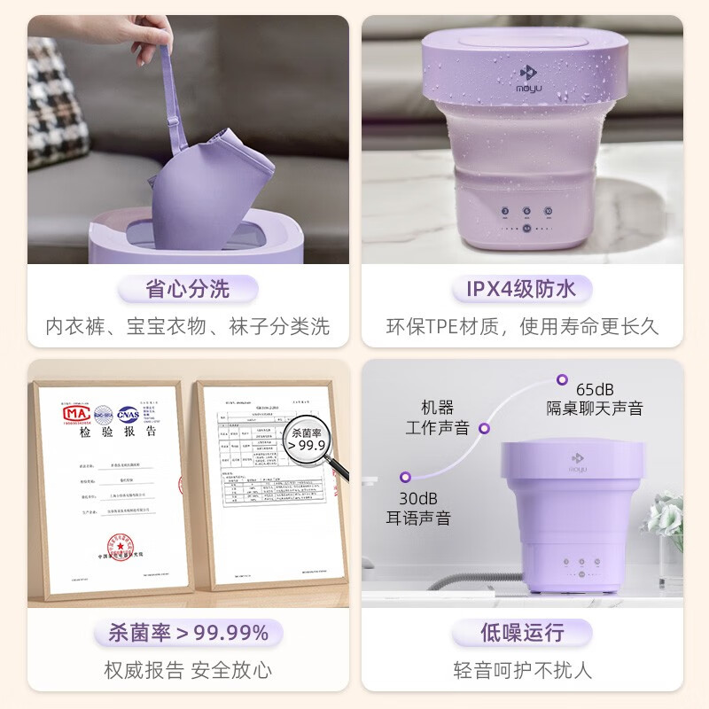 这款摩鱼mini折叠洗衣机具有分类洗涤、专衣专洗、避免交叉感染的特点。搭载抗菌波轮,仿手洗有效防缠绕,对衣物进行深层清洁,洗涤杀菌一步到位,打造全面的私户健康洗涤环境。采用巴氏杀菌,洗涤杀菌一步到位,底部采用耐高温材料,可用温水浸泡,深入纤维去渍更安心。强劲动力,纯铜电机经久耐用。分类洗地机,健康除菌洗涤环境,家中大人和小朋友衣物分开洗涤,专衣专洗拒绝交叉感染。额定功率10W,产品净重0.3KG,产品尺寸247x247x96mm。