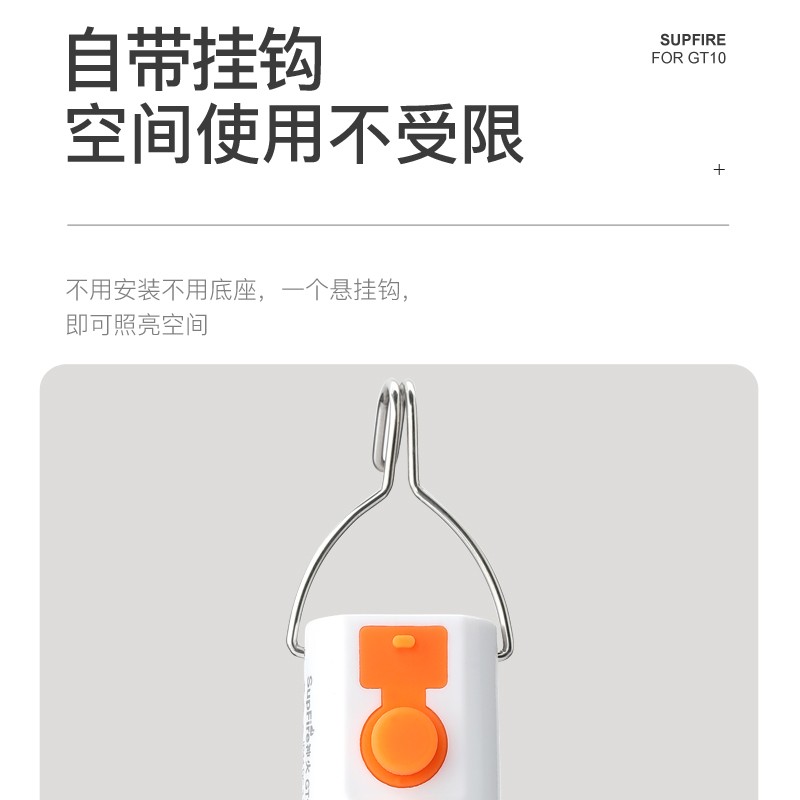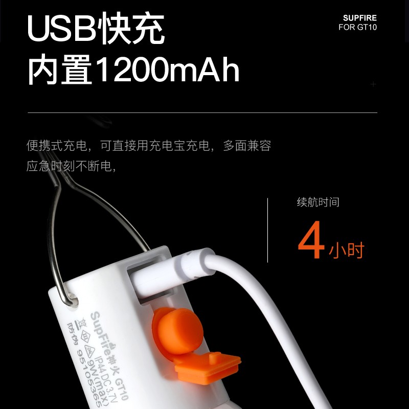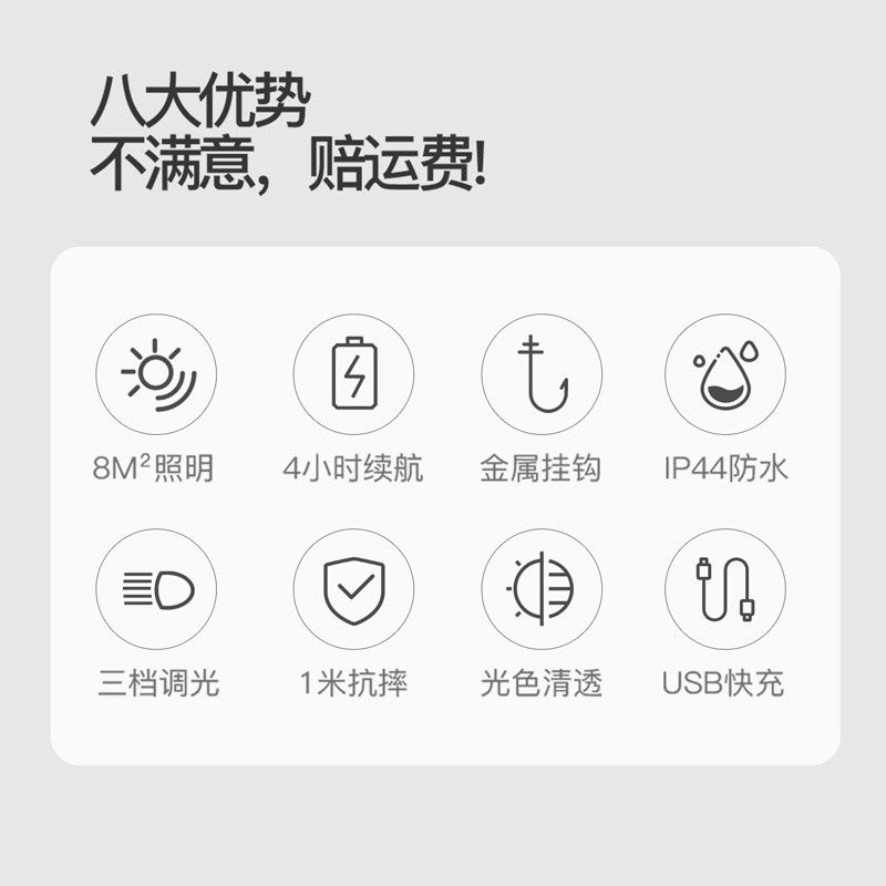 产品为USB充电式照明灯,带有挂钩,打开后拜托手持的烦恼,直接挂在某地方使用即可。产品有强光/省电/爆闪三个档位进行调节,带有电量提示,跟内置锂离子充电电池。电量不足的时候直接链接USB线充满电即可使用。