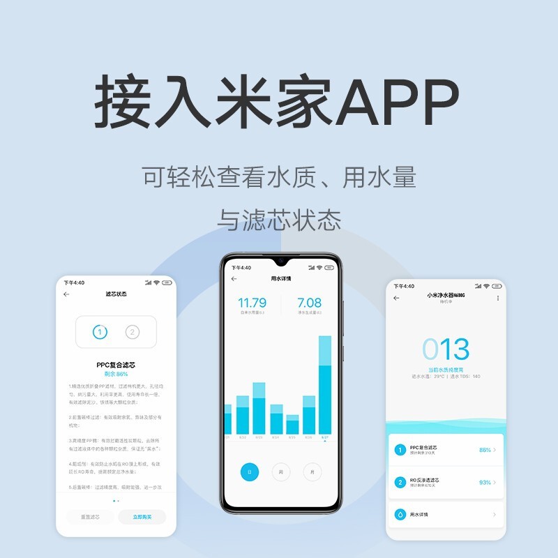 小米净水器H600G采用RO反渗透过滤,无罐设计即滤即饮,防止二次污染。具有600G大通量RO膜,出水速度可达1.58L/min,用水无需久等;采用新型复合滤芯,在两根滤芯中融合了六级过滤,改善了饮用水口感;同时配比更加合理,减少滤芯更换次数,两年仅需更换3只滤芯;H600G的纯水废水比最高可达2:1,达到国家最高标准一级水效,减少浪费,综合净水成本仅需0.24元/L。