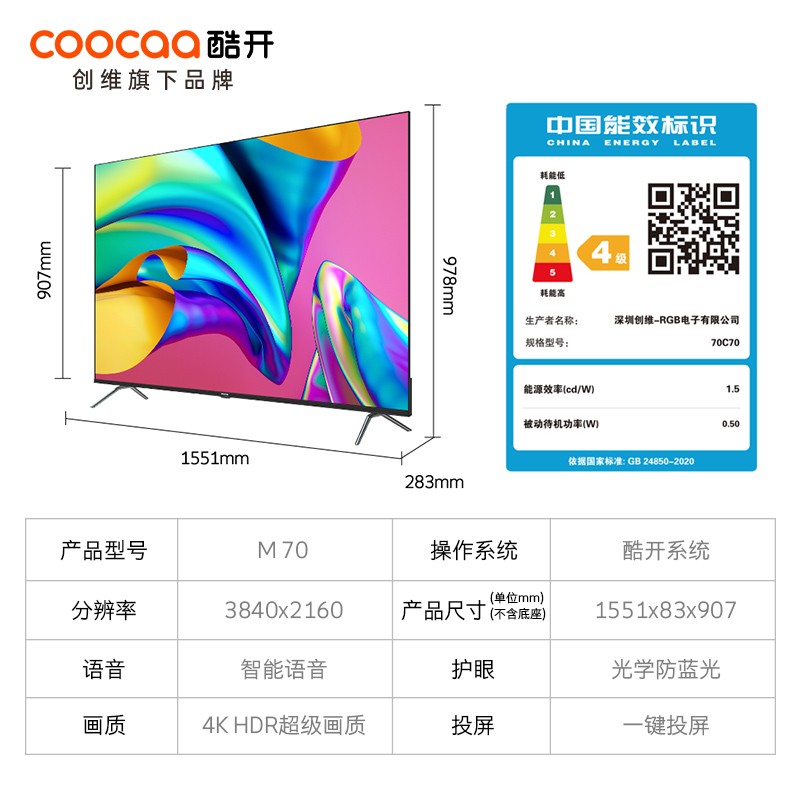 酷开 70M70 拥有70寸大屏,支持多屏互动,一键酷玩投屏,电脑办公投屏同样轻松,最大支持2TB扩展存储。AI远场声控,内置四阵列麦克风,无需遥控器即可操控电视,拾音精准无死角。光学防蓝光技术,采用波长在457nm以上的LED灯柱,有效减少蓝光。双核A73+双核A53的高性能芯片,配合2G内存+32G闪存组合,流畅播放4K高清视频和运行APP。MEMC运动补偿,使快节奏动态画面更清晰自然。