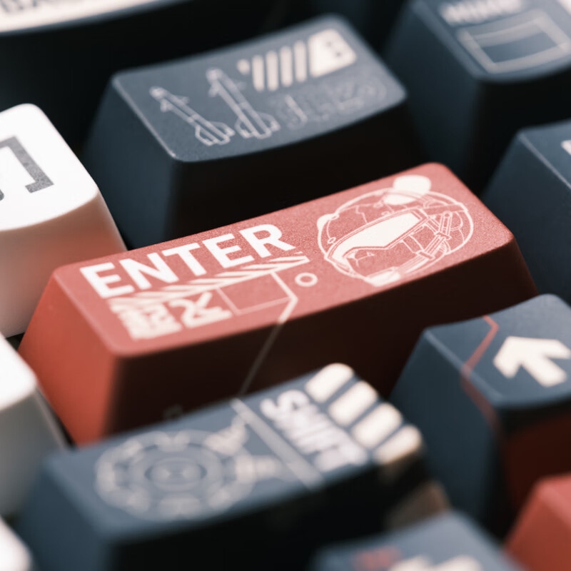 该键帽PBT材质,感上相对于ABS,有键帽不易打油,颗粒感较强等特点。采用五面热升华工艺,键帽表面图案别易磨损,图案清晰度更高,色彩饱和度更鲜艳。OEM键帽高度为11.8mm。
