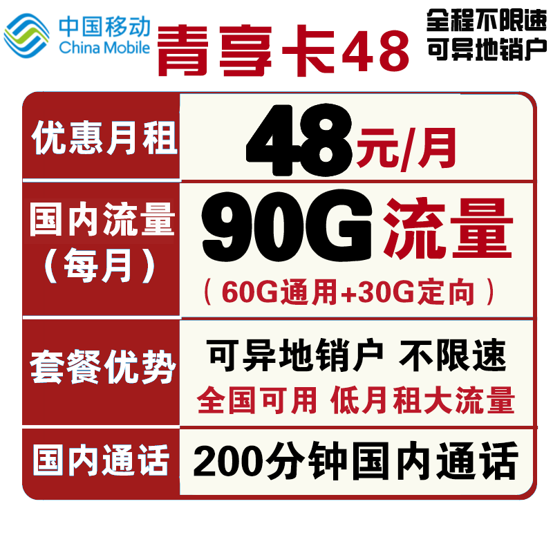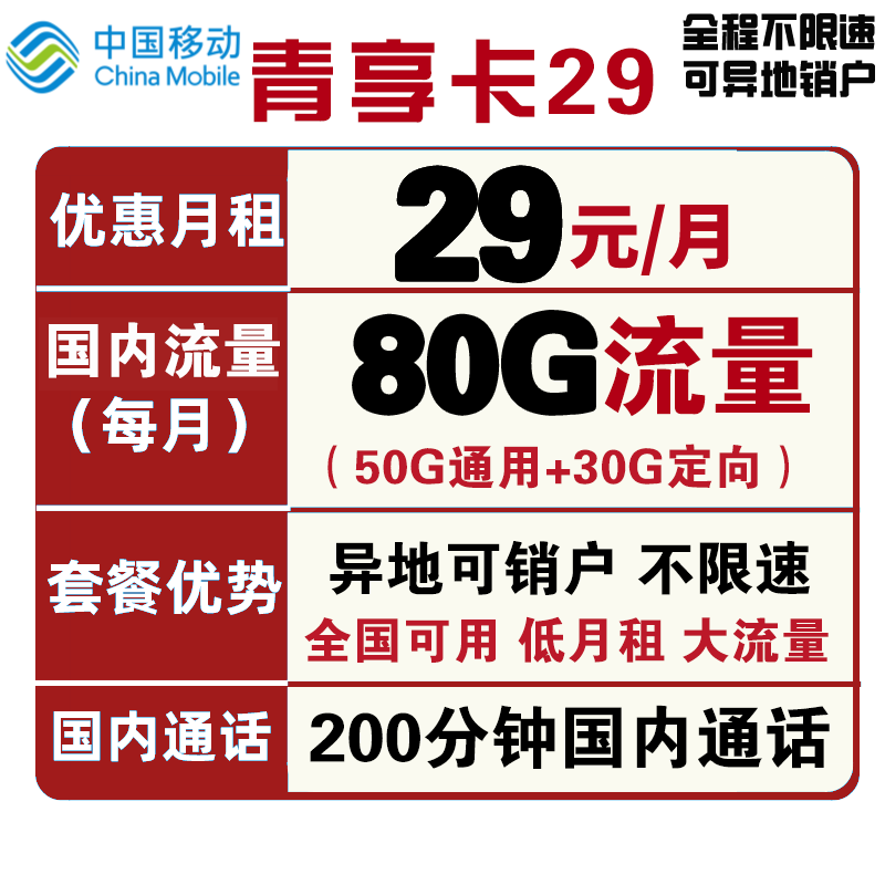 当前的位置: 首页 > 今日值得买 > 中国移动 手机卡流量卡高速上网卡校园卡包年5G套餐通用100g不限速畅享花卡青春电话卡青享卡新青卡 移动江畅卡29每月60G全国流量+300分钟国内