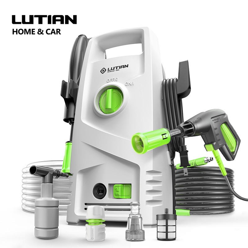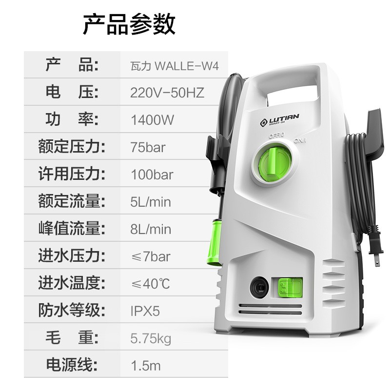 此款机器白色外壳,轻便小巧,安装快捷方便,使用方法简单,1400W功率,搭配6米出水管,3米进水管,自动关枪停机,360度防水等级,适合用来家庭洗车,额定压力75bar,峰值压力可达100bar,额定流量5L/min,
