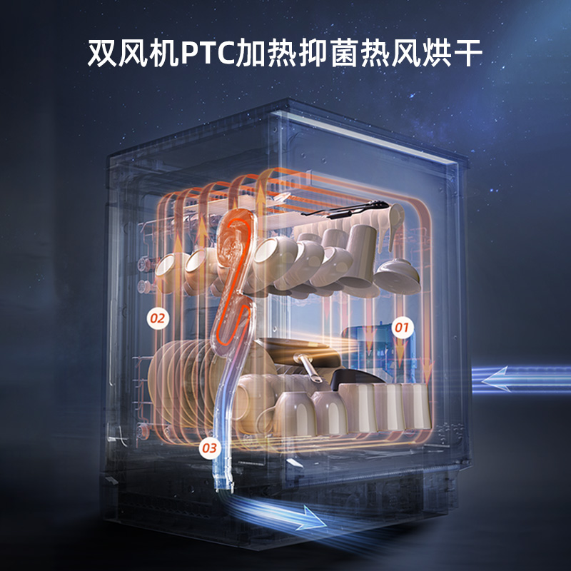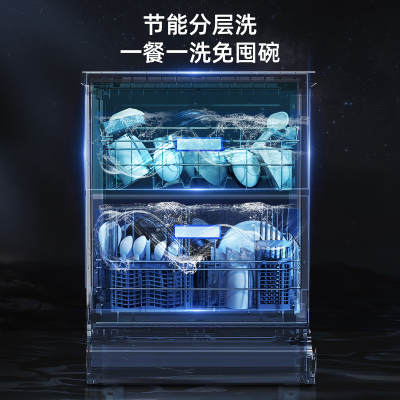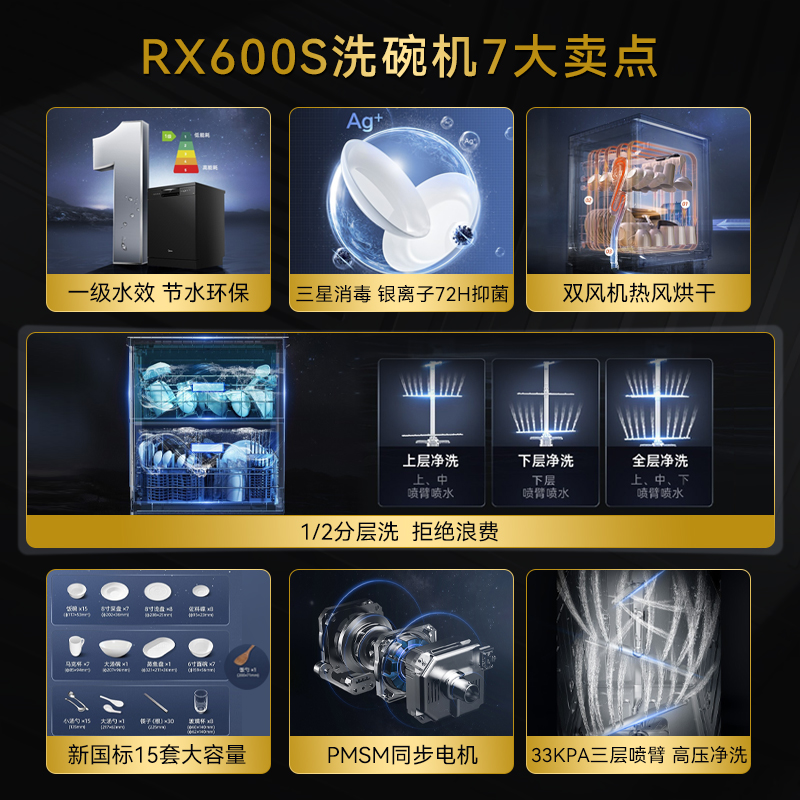 美的RX600s洗碗机,具备15套洗涤容量1级水效。内部有三层喷壁,配合33kPa的高压水流清洗。支持分层洗,在少量餐具时更节省用水。72℃除菌洗,带有银离子杀菌。PTC热风烘干,启动热风,加速水蒸气蒸发,避免发霉潮湿。72小时抑菌存储,自动换气循环。3种主程序:超强洗,节能洗和快速洗。六种APP扩展程序和三种叠加程序。洗碗机支持自清洁,强力火锅洗,轻松去除油污。支持WiFi链接,嵌入和独立两种方式摆放,支持软水,24小时定时。产品尺寸长600mm;宽600mm;高805mm。