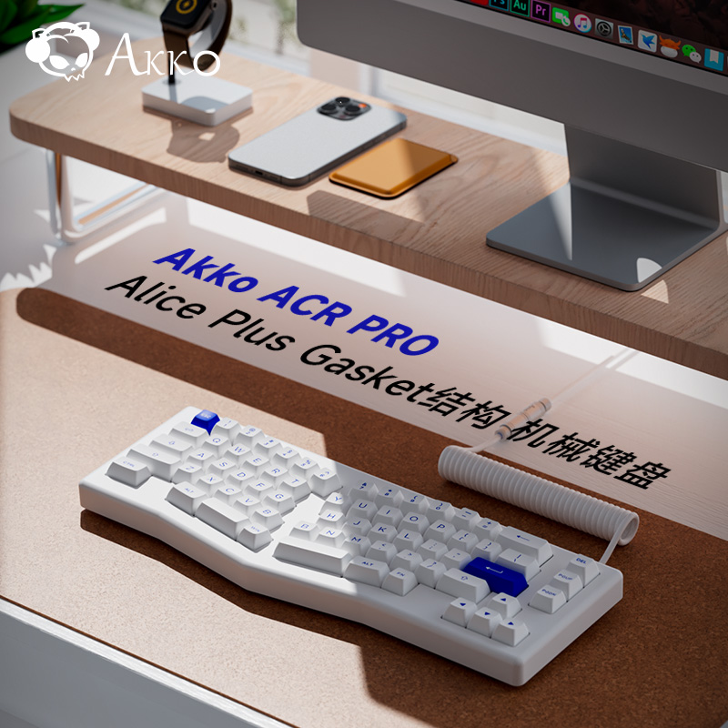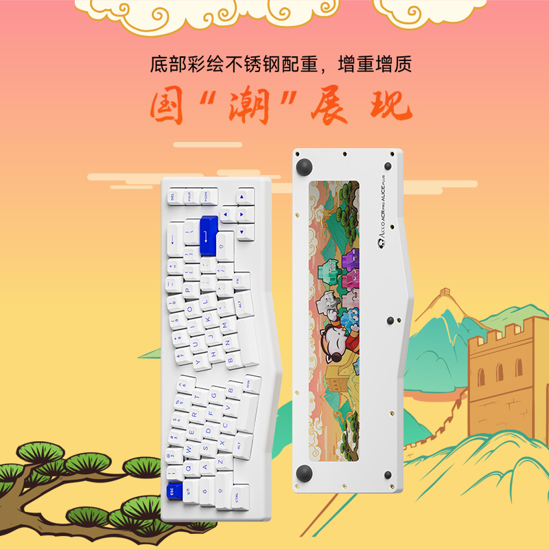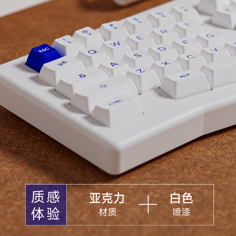 这款键盘使用分体式键位设计,标准指法,打字神器。采用软瘫Gasket结构,PC定位板,“麻将音”享受。使用亚克力材+白色喷漆,底部彩绘+不锈钢配重。可选水晶轴、银轴。