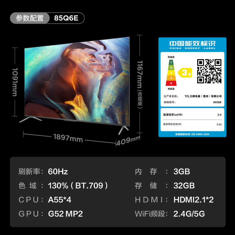 TCL 85Q6E 液晶电视背光源采用新红荧光粉材料,将色域值提升至130%的BT.709,使画面色彩更接近真实世界。混合调光技术,画面不闪烁,护眼同时更加节能。搭载MS848C芯片,采用双核A73+双核A53架构,搭配3GB内存+32GB闪存组合,运行APP更加流畅,轻松解码4K原盘视频。支持蓝牙5.0和双频WiFi,网速更快,扩展能力更强。采用阵列式麦克风,支持12米免遥控声控,语音控制的范围更广,实现功能更丰富。