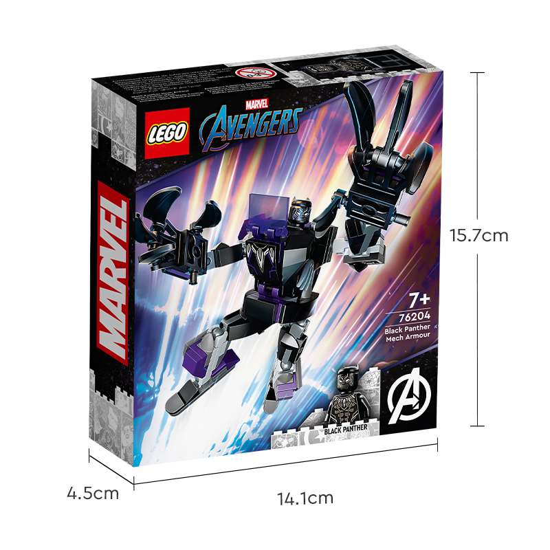 黑豹机甲(76204)属于漫威系列积木套组, 首发于2022年,整个套组包含 124 个积木颗粒。这款强大的玩乐和展示一体式机甲可以将这位带有利爪的复仇者联盟成员转变为一个巨型的超级英雄战士。