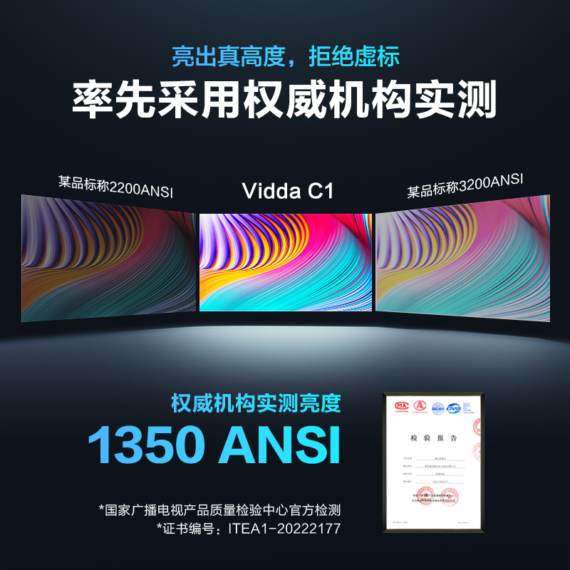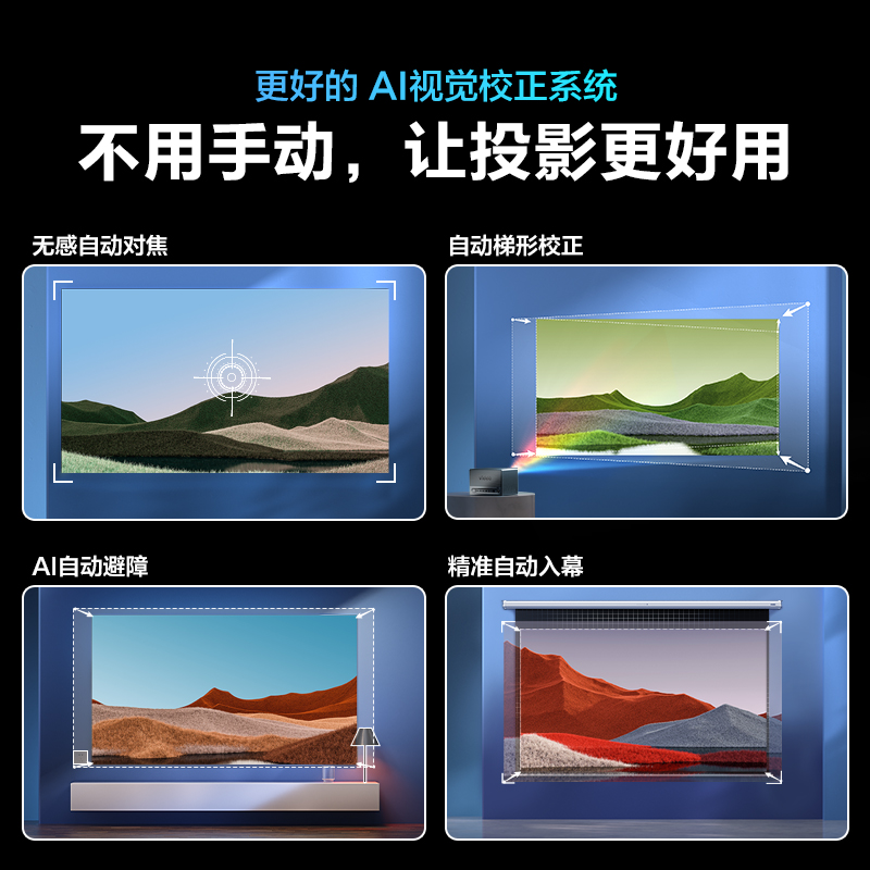 采用MEMC运动补偿,画面不抖动,不拖尾。C1拥有更高阶的软件智能算法,强大算力精准识别动态影像,插帧补偿,消除拖尾,观感流畅、干净利落。内置Vidda A智能校正系统,采用双目动态识别技术,借助2块高精度CMOS模组、1组ToF激光雷达以及1个高灵敏光线传感器,通过Vidda自研智能校正算法,结合万亿级算力APU计算单元,做到极快速的自动精准校正。可使用自动对焦+自动梯形校正+自动避障+自动入幕,使用更舒适、摆放更随意。