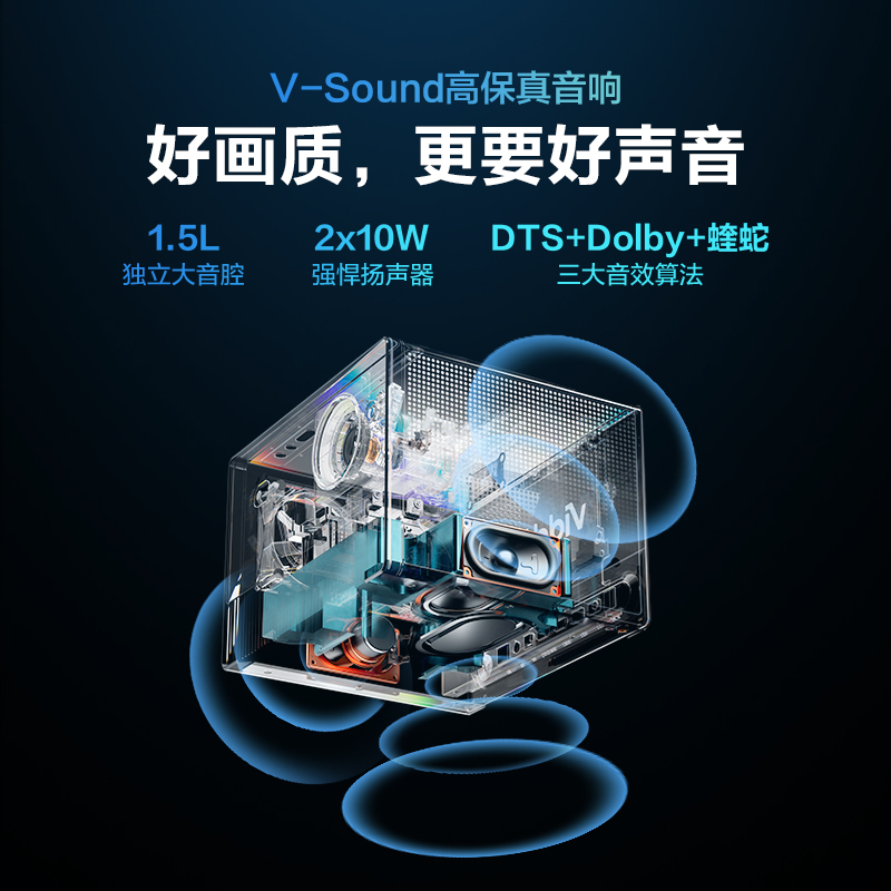 支持游戏模式,最高支持240Hz超高刷新率、游戏模式下可实现12ms无感低延迟,为你带来开挂般的流畅体验。单独设计了1.5L的混音大音腔、2×10W超大汝铁硼磁钢扬声器样以及2个无源辐射器,搭配杜比、DTS、蝰蛇三大音效算法,软硬兼施,使高音透亮、低音震撼。内置JUU海量影音娱乐资源,看、听、学、玩、唱肆意畅享。
