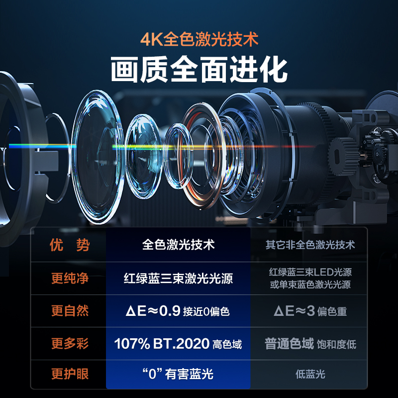 IMD星空极光科技美学设计彰显出C1的格调轻奢,如同一个精巧的Cube魔盒熠熠生辉;普鲁士蓝一体金属机身浑然天成,无论放在家里哪个角落,都像一件艺术品。光源使用100%RGB三基色激光光源,使用4K全色激光技术,拥有202%高色域,色彩丰富饱满,△E≈0.9高色准,显现更自然拒绝偏色,10.7亿色彩过度更均匀;亮度高达1350 ANSI流明,搭载MT9669芯片,4G+64G内存,在4K影音、游戏等体验都感觉游刃有余。