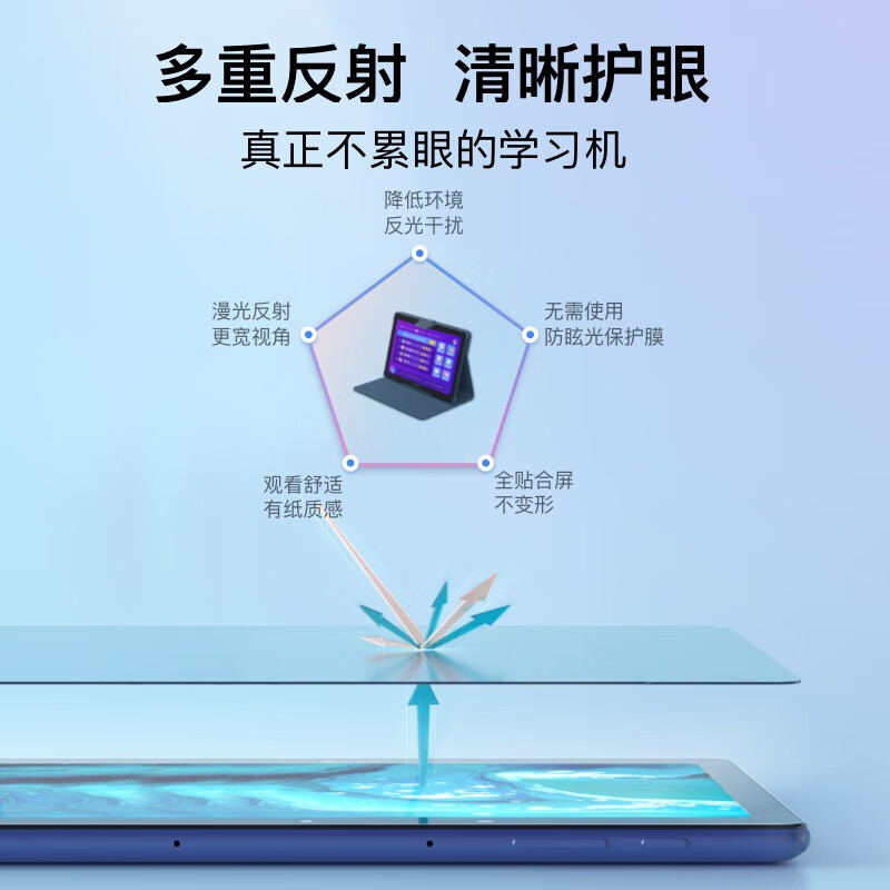 小度学习平板屏幕采用护眼防眩光AG蚀刻工艺,通过雾化技术实现类纸更大视角观感,镜面反射光形成类纸面漫反射效果,让孩子居家学习时用眼更轻松舒适。AG化学蚀刻磨砂技术,不仅能能永久级改变玻璃表面纹理,从不脱落,持久防眩光;还能将屏幕显示的光线打散,柔化显示光线, 提升观看视角,爱护孩子视力健康。