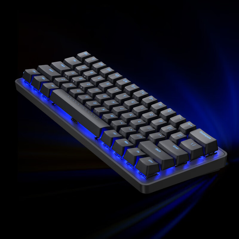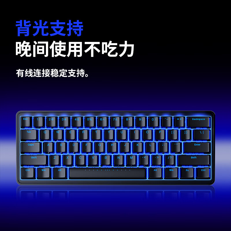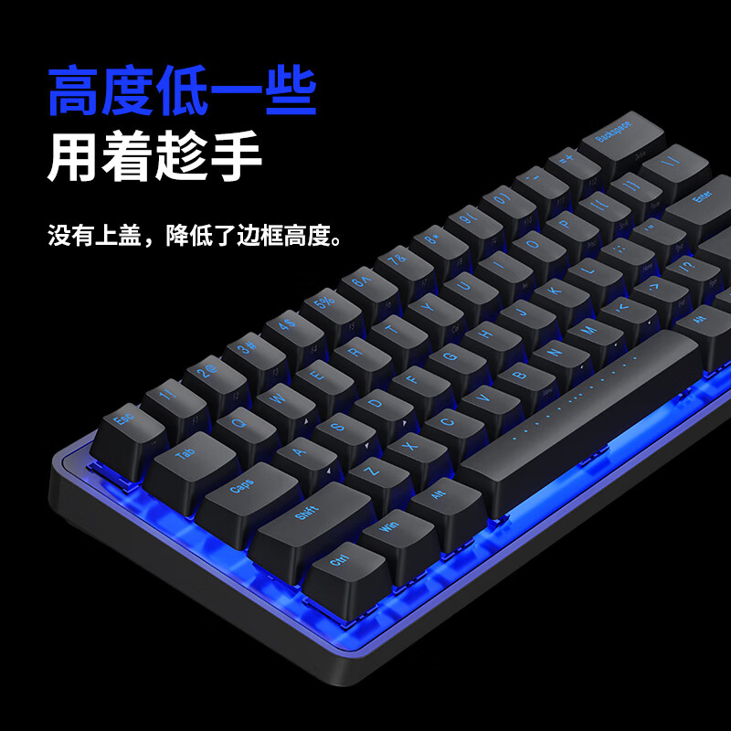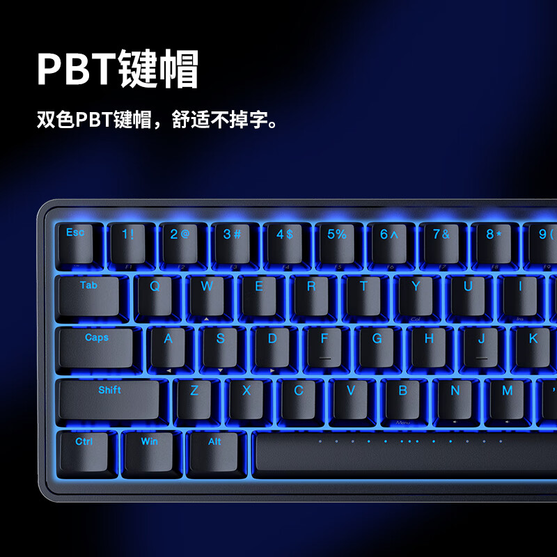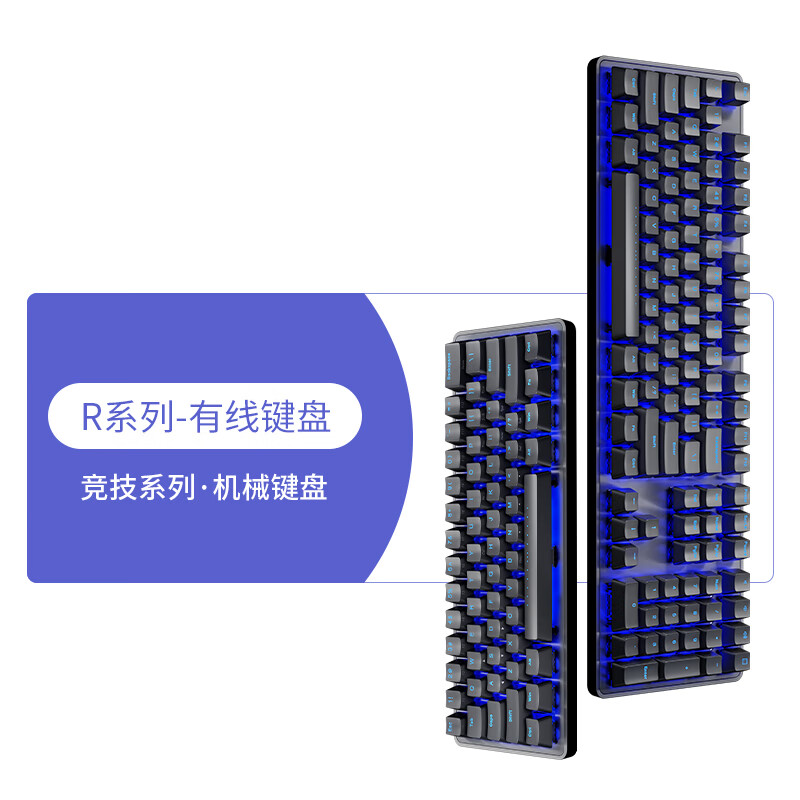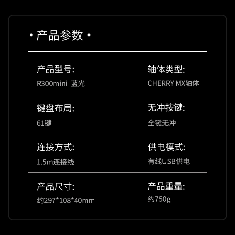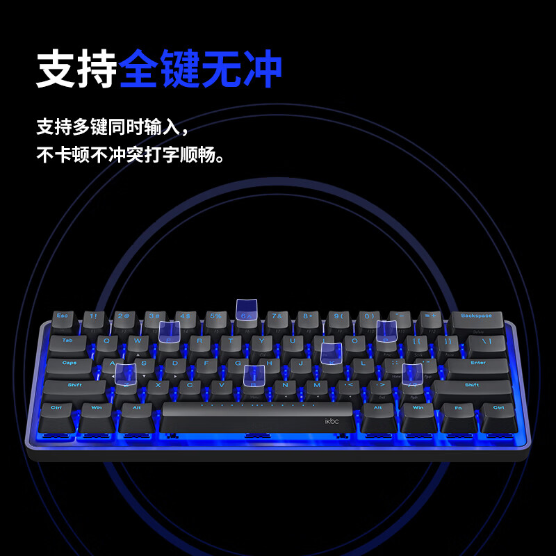 iKBC R300mini 机械键盘,PBT双色键帽,干燥、耐磨。蓝光键盘,畅快输入拒绝延迟。拥有智能灯效调节,通过非常便捷的Fn键操作,调节明暗快慢。采用CHRERRY MX机械轴,具备5000万次以上的敲击寿命。