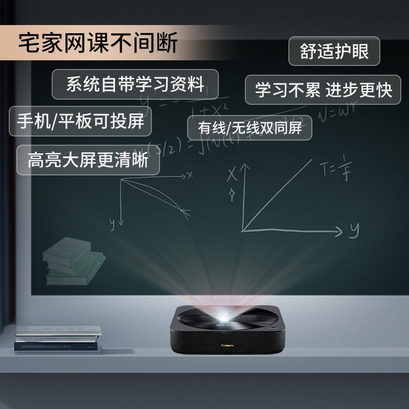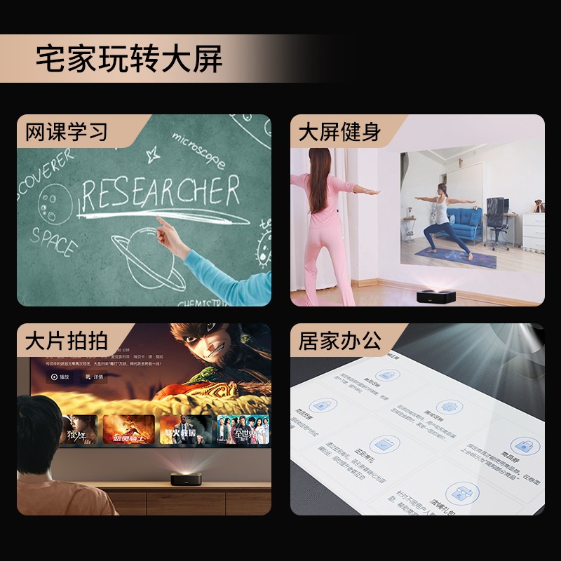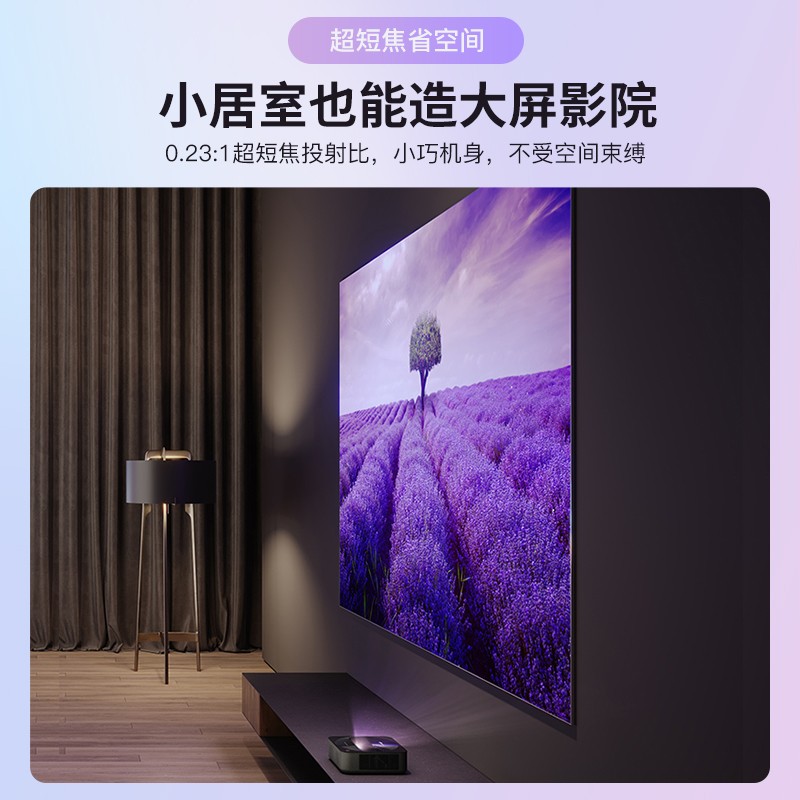 峰米R1 Nano短焦高清家用投影机,采用ALPD激光光源,投影比仅0.23:1,离墙25cm的距离可投射80英寸的画面,入手它你可以像传统电视机一样设计装修家庭影院,不同点就是屏幕大小轻松过百寸。而且它的性能配置达到主流的家用投影机水平,拥有1920*1080的标准分辨率,1200ANSI流明,高清电影、网络电视轻松放映。