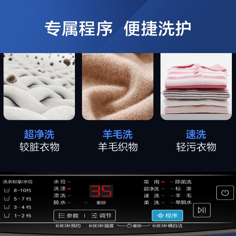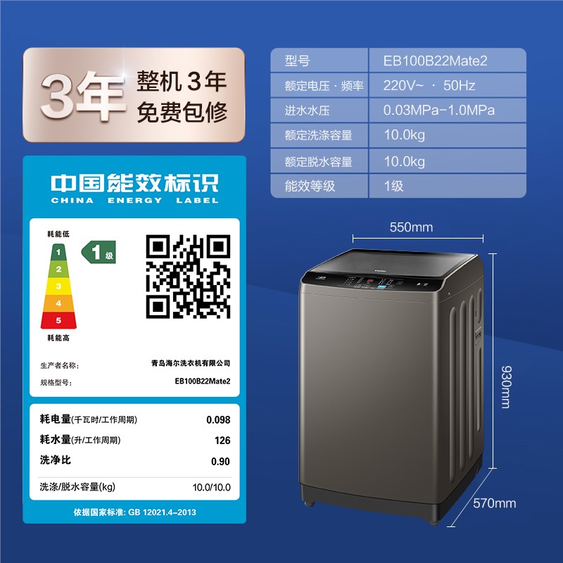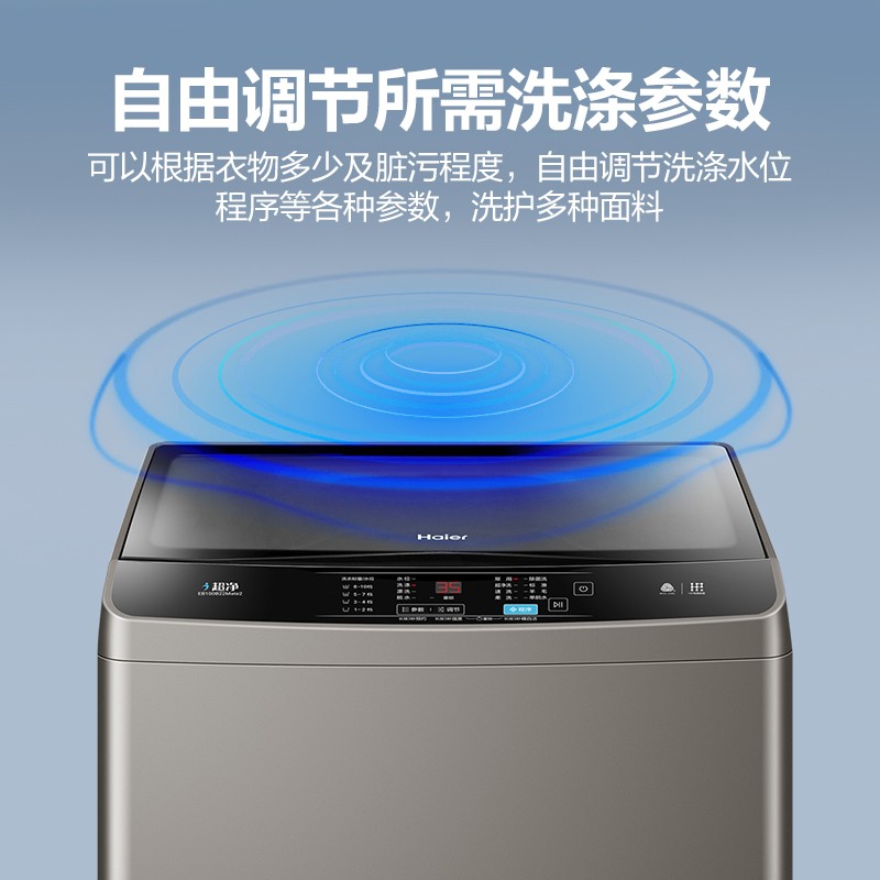 Haier 海尔 EB100M39TH,波轮洗衣机,10KG大容量,满足大家庭洗衣需求,智能双水位,低洗高漂,洁净省水。强劲水流动力澎湃净力超群。宽水压搭配宽电压设计,突破水电压不稳的局限,高层、平房都能轻松洗衣不受限制。