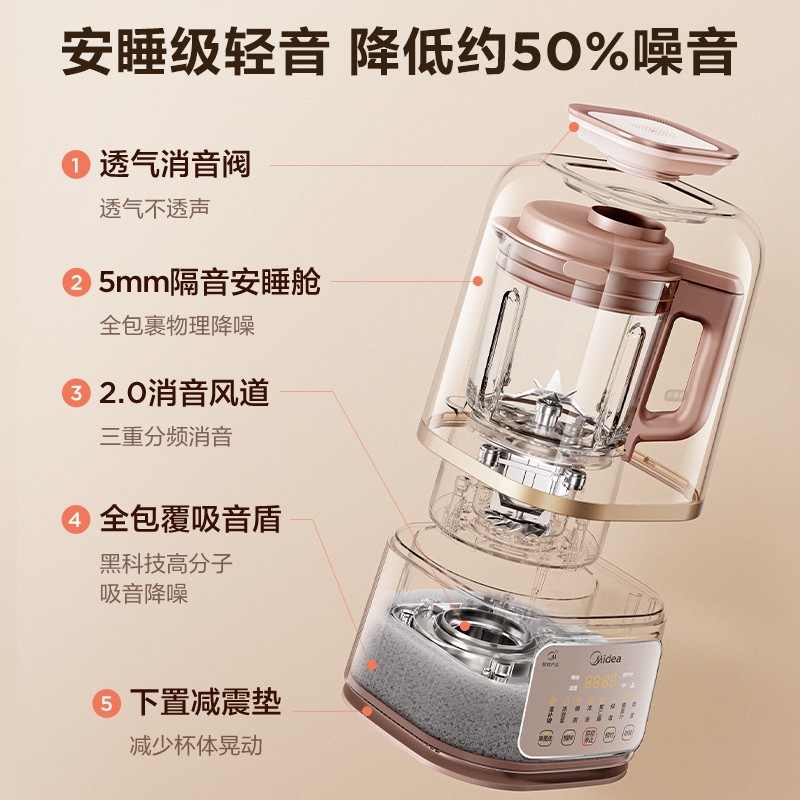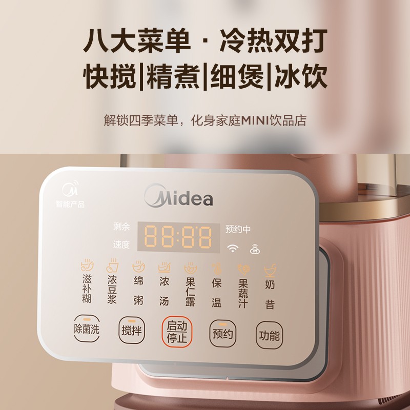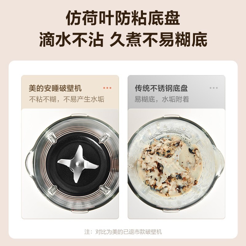 美的 MJ-PB80S2 破壁机,WIF互联智能预约,采用升级陶瓷不沾底盘,隔音罩包裹,加厚物理隔音降噪,360°真实物理消噪,隔绝噪音,声音低至52分贝,800W大马力,12小时预约。