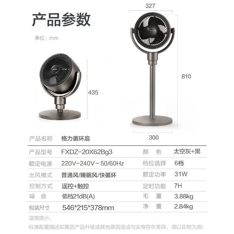 GREE 格力 FXDZ-20X62Bg3 直流变频空气循环扇,创新性的后置滤网,过滤风中粉尘毛絮,网罩易拆易清洁。导向聚风风筒设计,最远送风距离13.6m,多角度广幅送风,加速空气循环。7小时智能预约,台地两用,直流变频电机,6档风速,3种模式,遥控+触控两种控制方式,额定功率31W。