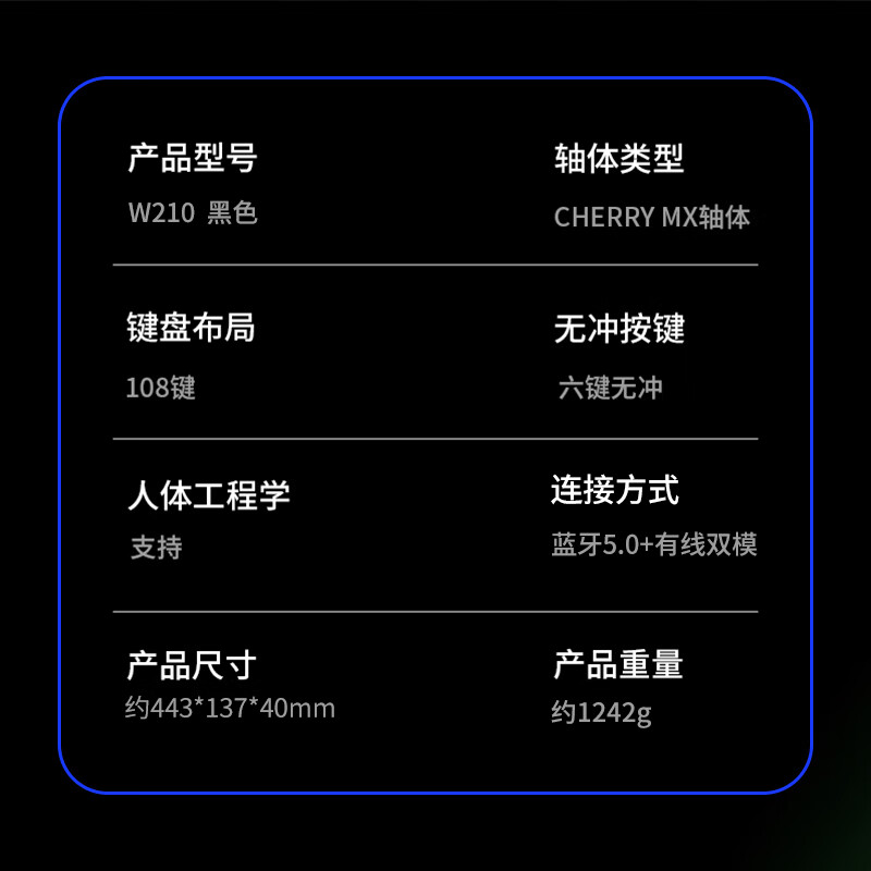 W210使用Cherry机械开关及PBT镭射键帽,108键布局加两段式脚撑设计。2.4G无线连接,接收器免驱安装,配备续航时间约为6个月,配备电量提醒功能。尺寸约为443*140*42mm,提供1年质保。