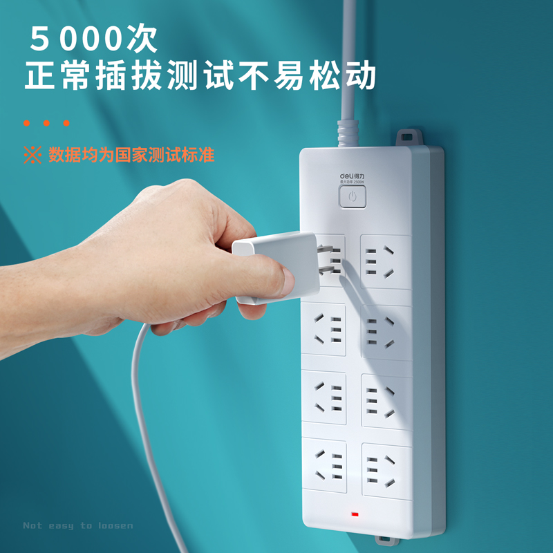 得力18262新国标8位组合孔插线板,3米总长,42mm大孔距,总控开关,8位5孔组合,带儿童保护门,单色提示灯,外置双挂推脚孔。256*93*32mm。