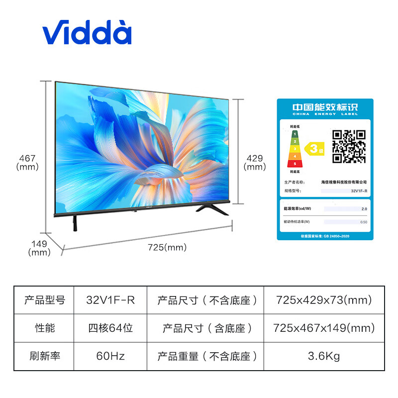 海信 VIDAA 这款型号为 32V1F-R 32英寸 的液晶电视1080P全高清分辨率,运行内存1G,存储内存8G,CPU4核64位处理器,直下式背光,全高清,三级能效,边框塑料材质,产品重3.7Kg,内置VIDAA AI系统,下载APP智能控制。