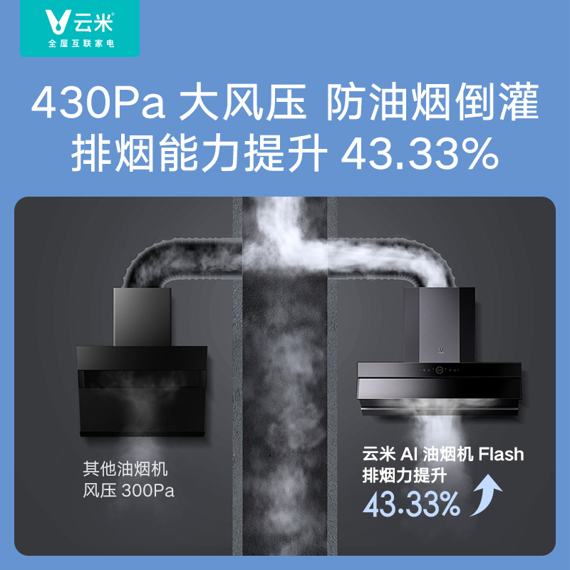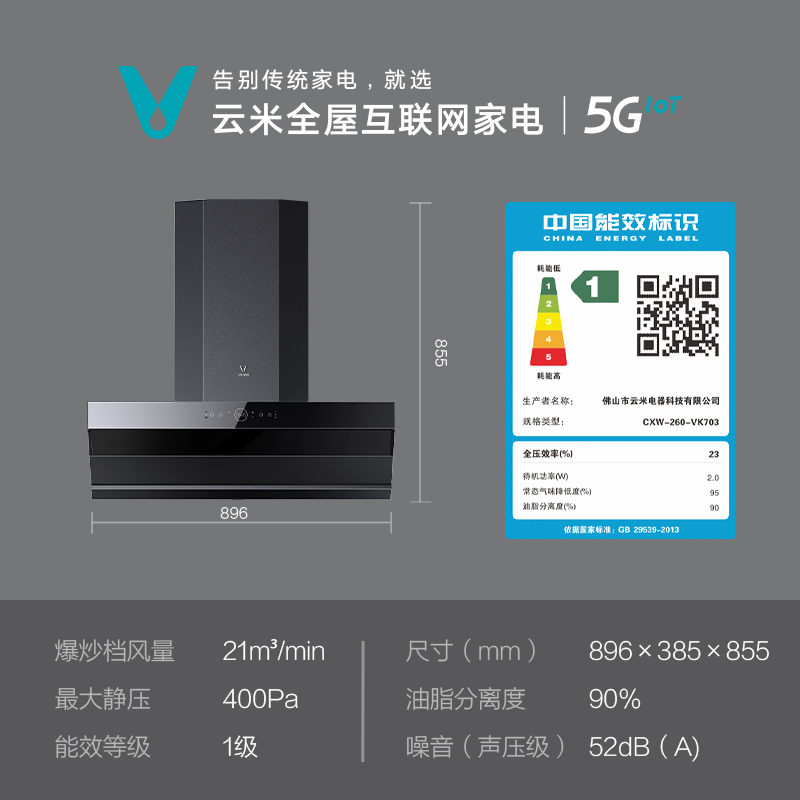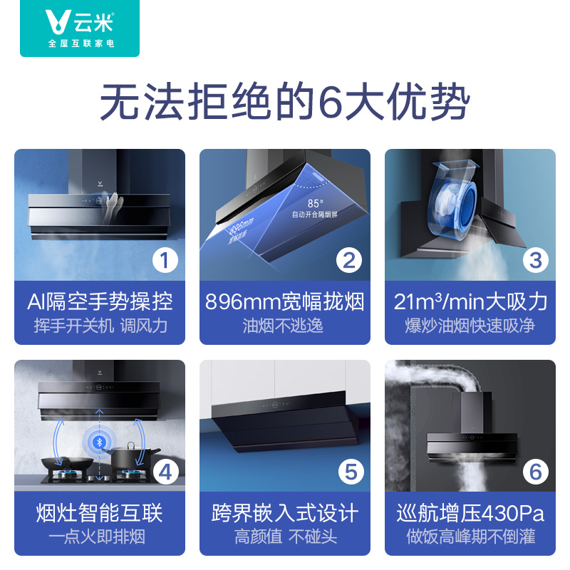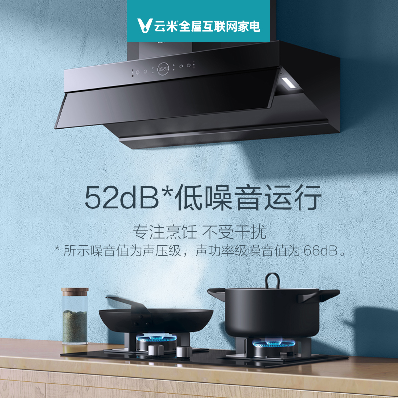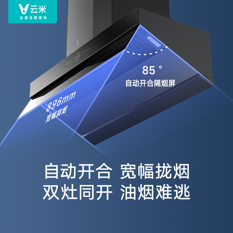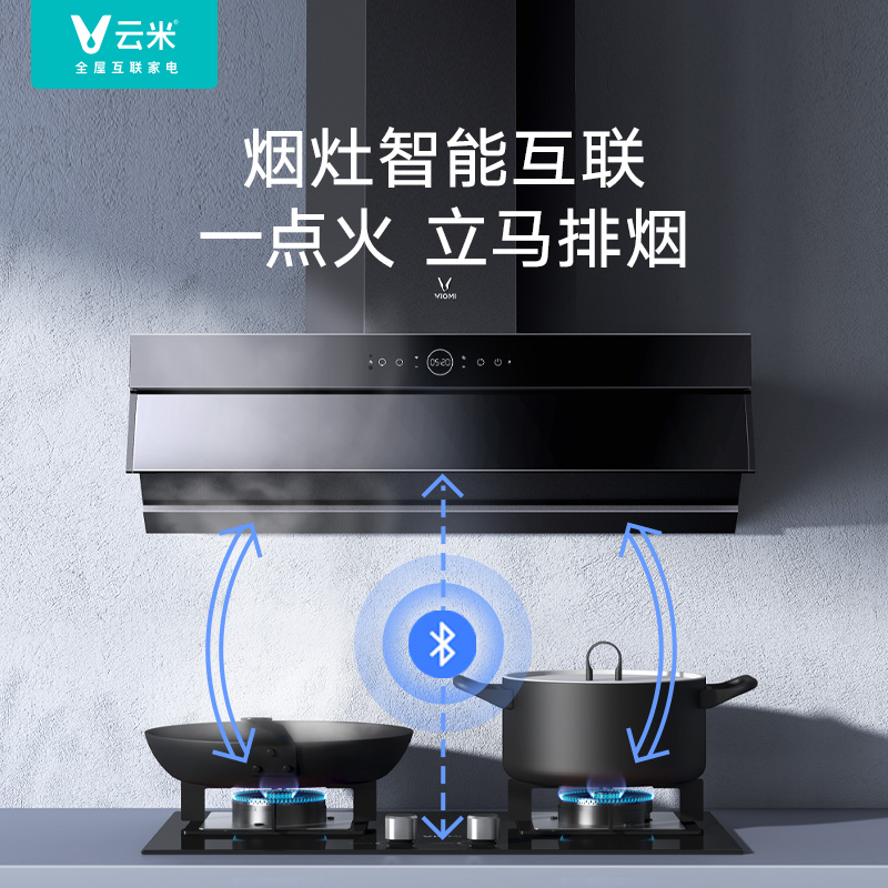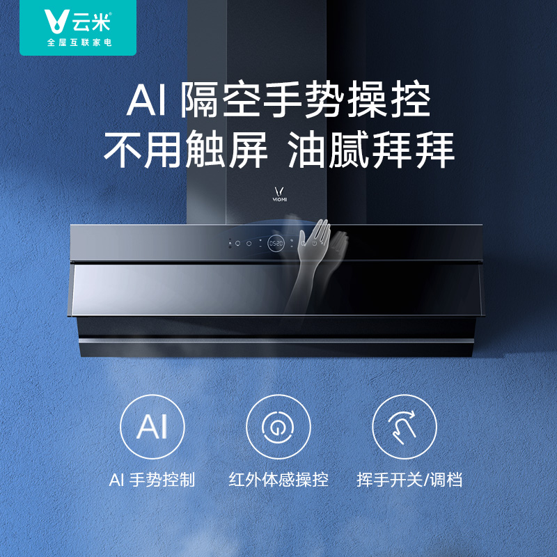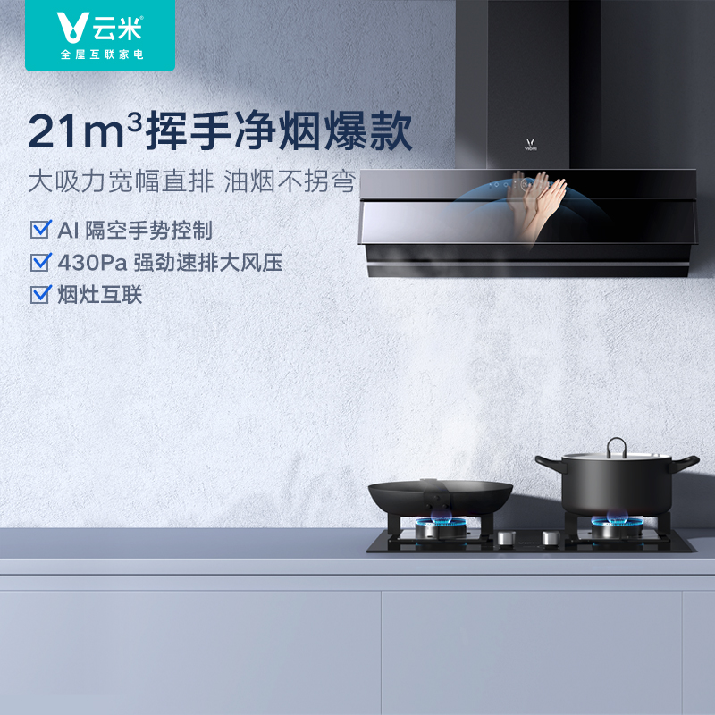 云米 CXW-260-VK703 烟灶套装,产品属于顶吸+侧吸的结合,美观不碰头,也更省空间;AI手势操控和红外体感遥控,挥手开关机,调节风力,不触碰烟机, 操控更便利;21m3/min大吸力,巡航增压400Pa,吸排皆强悍。可搭配云米燃气灶智能联动。最大噪音66dB。