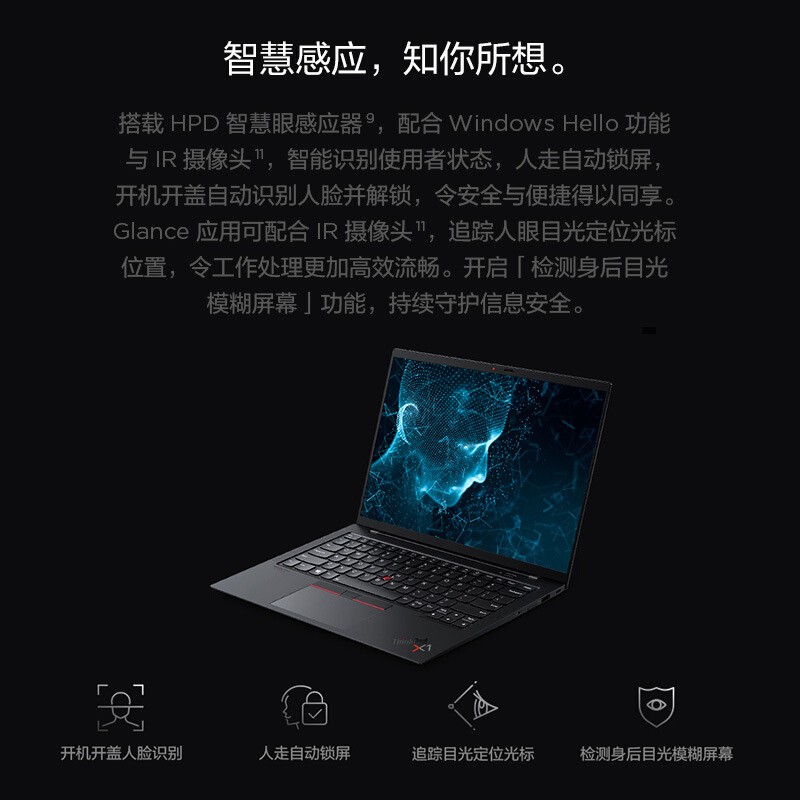安全方面,支持ThinkShield解决方案,电源键集成指纹识别,离开自动锁定,可选红外镜头休眠人脸识别登录。接口则有两个雷电4、两个USB-A 3.1、HDMI 2.0、一个3.5mm耳麦,可选microSIM插槽。网络AX201 Wi-Fi 6(2x2)和蓝牙5.1,可选4G/5G模块,音频杜比Atmos四扬声器电池57Whr,标称续航16小时,搭配USB-C 65W快充头,白色LED背光键盘,4.33寸触控板