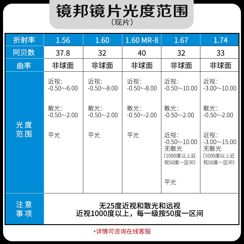 镜架轻盈纤细,质感满满,框型分为全框和半框,总有一款适合您。钛架材质耐腐蚀耐生锈,使用寿命长,经久如新。设计简约商务与轻相伴,镜腿金属材质超大弹力,大脸不夹小脸不掉。1.74日本进口超薄低反防蓝光镜片,让对镜片厚薄有严格要求的您和高度数的您不再惧怕镜片的厚度,还能有效抵御有害蓝光,减缓你度数的加深,缓解视疲劳,让你拥有更高质量的视觉体验。