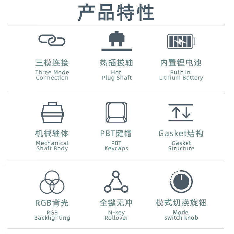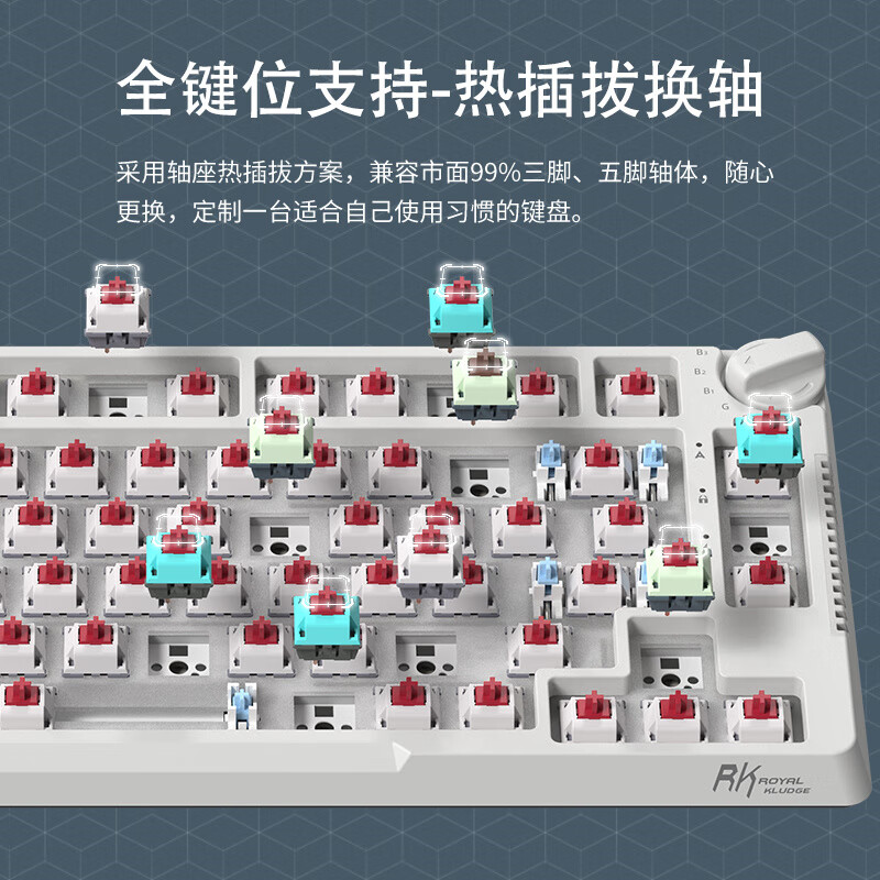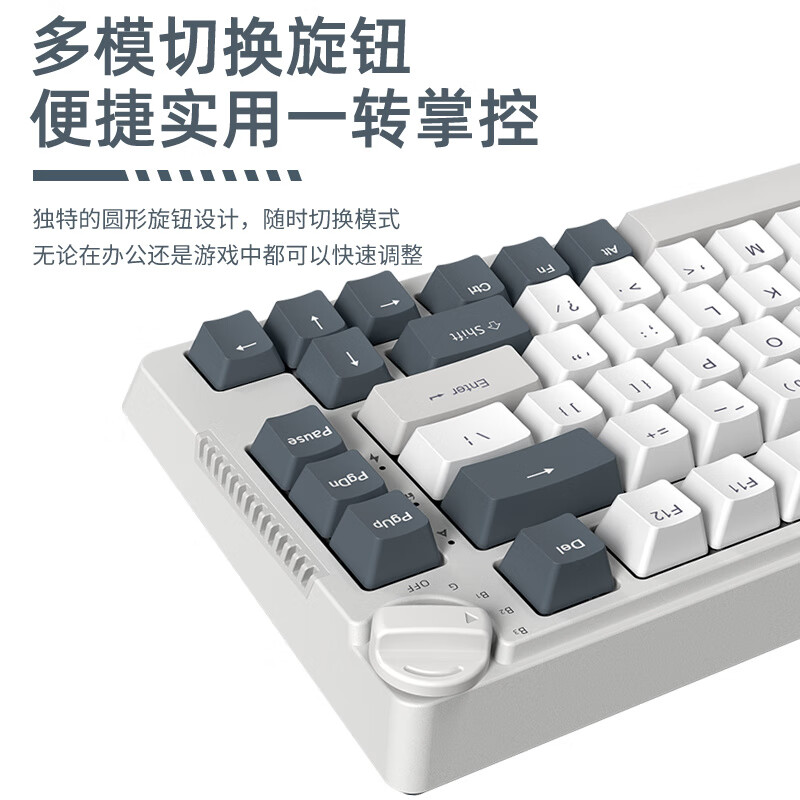 该键盘采用75%布局,轴座热插拔方案,兼容市面99%三脚、五脚轴体,随心更换。选用TTC系列轴体。支持2.4G无线/蓝牙5.0/有线三种连接模式。填充消音止震,消音棉×轴下垫,添加双重消音材料,填补键盘内部空隙减小空腔音,提供扎实手感。独特圆形旋钮设计,随时切换模式,无论在办公还是游戏中都可以快速调整。RGB动态背光,支持音乐律动,约1680万种灯光颜色可调节。配置PBT二色键帽,表面干燥纹理细腻,耐用程度远高于ABS材质,长久使用表面不油光,带来舒适操作体验。内置3750毫安可充电锂电池,全键盘背光打开调节最亮,持续不间断使用30小时左右,全键盘背光调节最暗,持续不间断使用220小时左右。