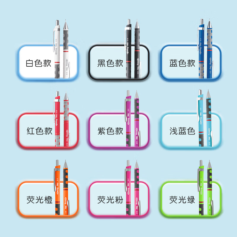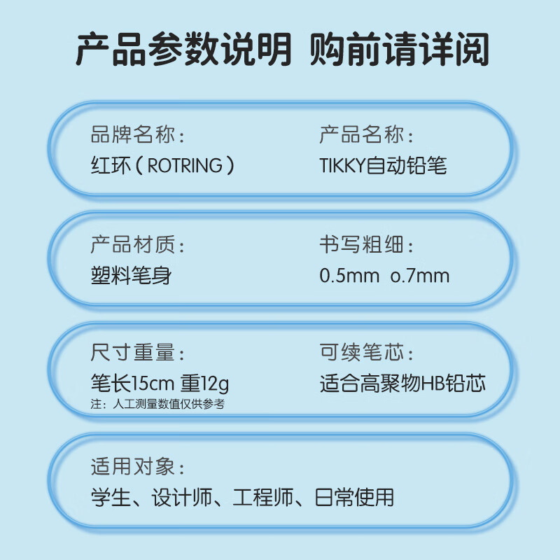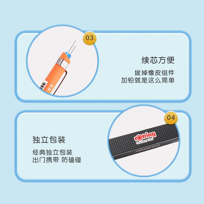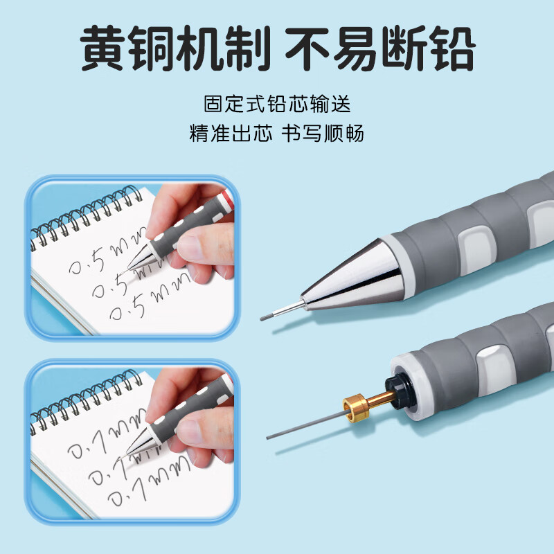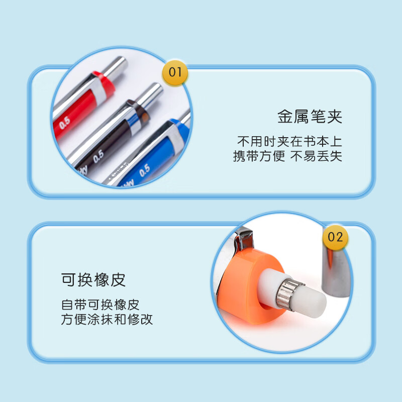 按钮式笔帽下内置橡皮,适用于书写、练字、绘画、工程制图,三角形笔杆便于轻松绘图,抓握区经过贴胶处理,触感柔软,使用舒适。