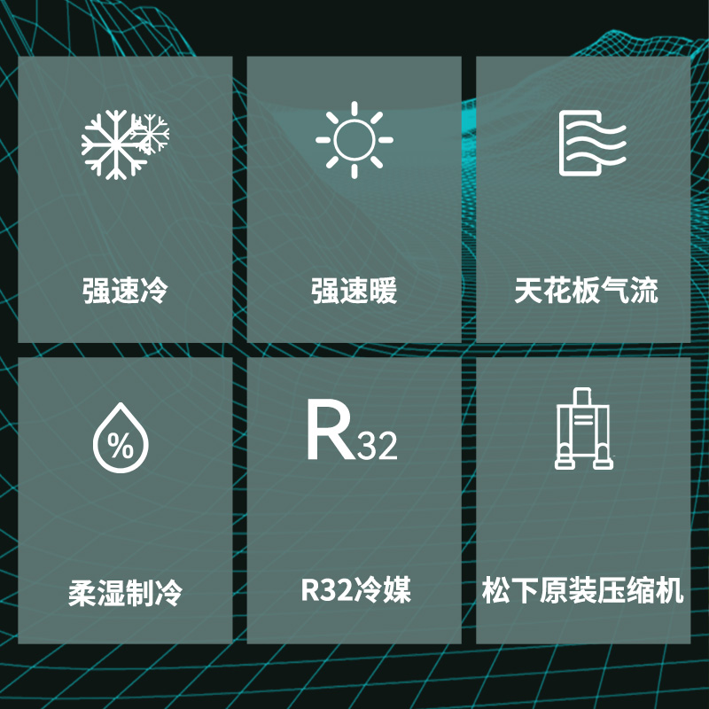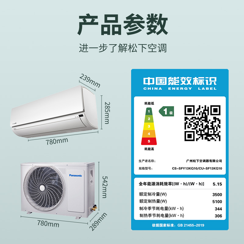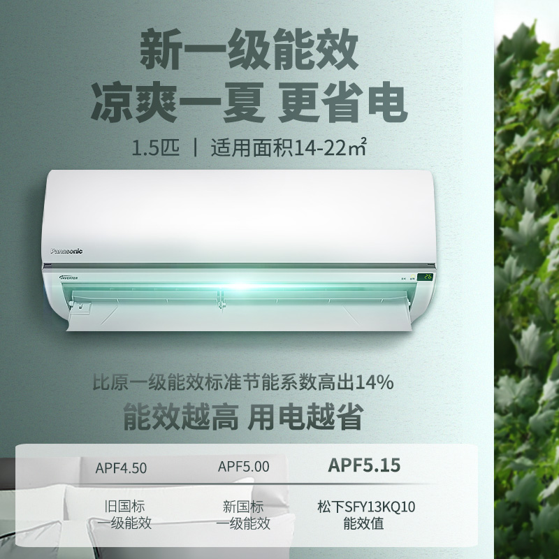 松下于2021年推出SFY系列新一级能效机型,包括1匹和1.5匹两种规格,采用R32冷媒,其中1.5匹机型SFY13KQ10和1匹机型SFY9KQ10的APF值均为5.15,符合新一级能效,采用松下原装压缩机,强速制冷,1分钟出风口温度达17℃,支持天花板气流。