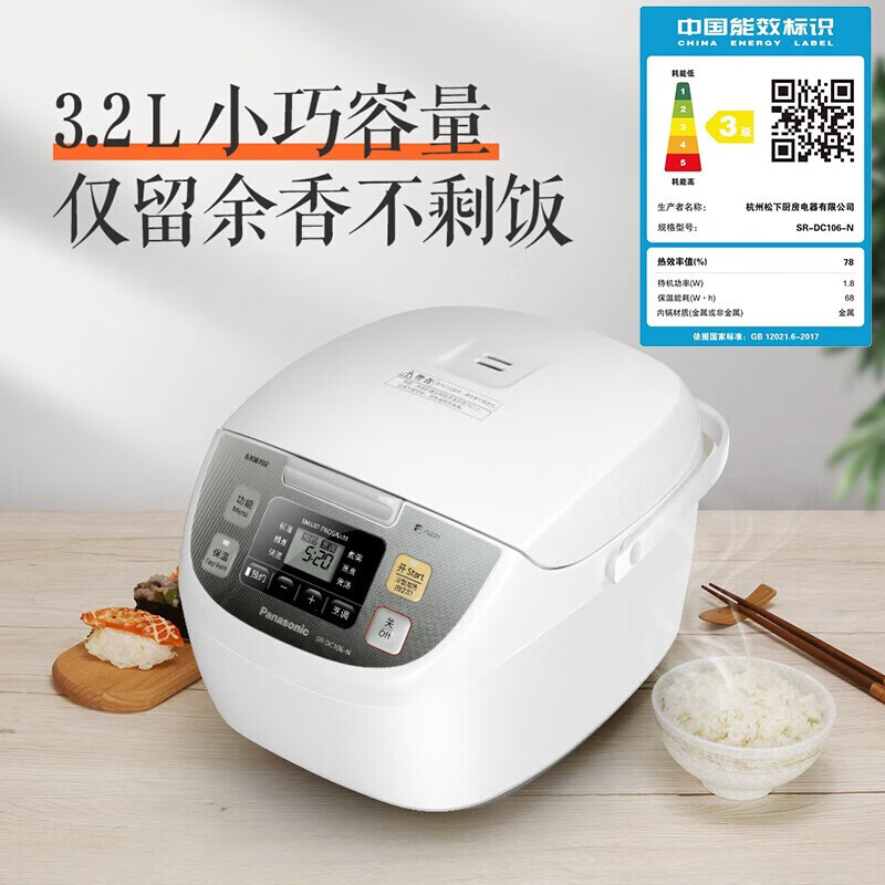 Panasonic 松下 SR-DC106-N 电饭煲 3.2L,备常炭厚锅,立体加热,3.2L小巧容量,6大炊煮功能,24小时预约,智能米量判定。