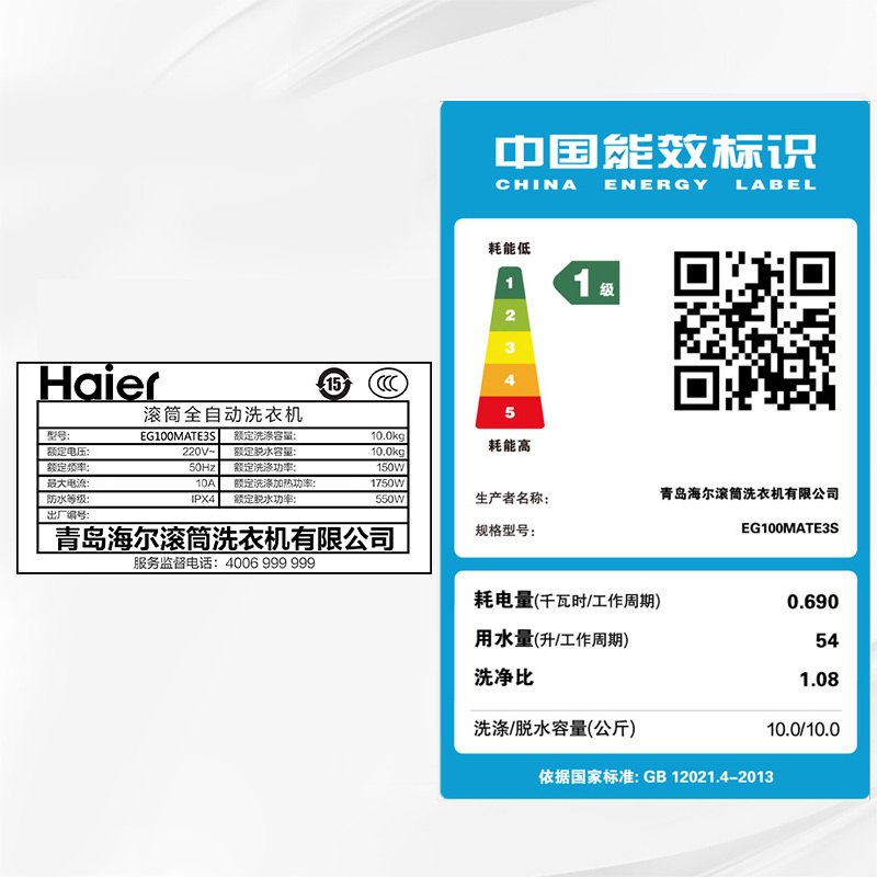 证书编号:2017010705017445证书状态:有效产品名称:滚筒全自动洗衣机3C规格型号:见附件产品名称:Haier/海尔 EG100MATE3S洗衣机品牌: Haier/海尔海尔洗衣机型号: EG100MATE3S使用方式: 全自动洗衣程序: ,单脱水 筒自洁 羽绒洗能效等级: 一级产品类型: 滚筒洗衣机电机类型: BLDC变频电机