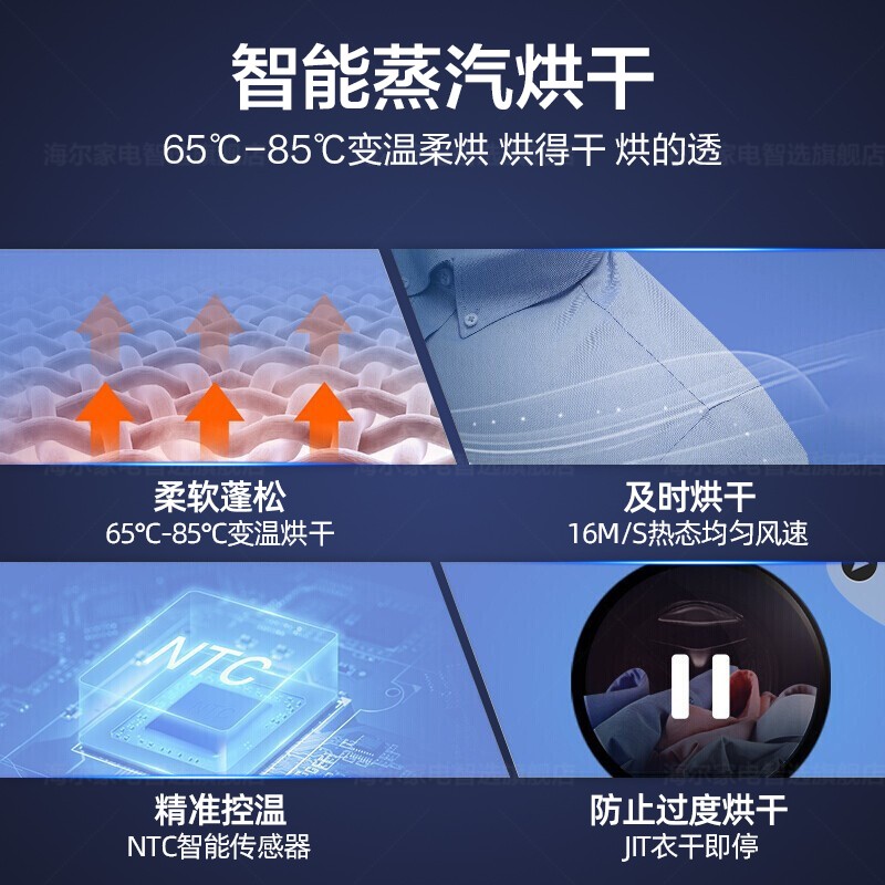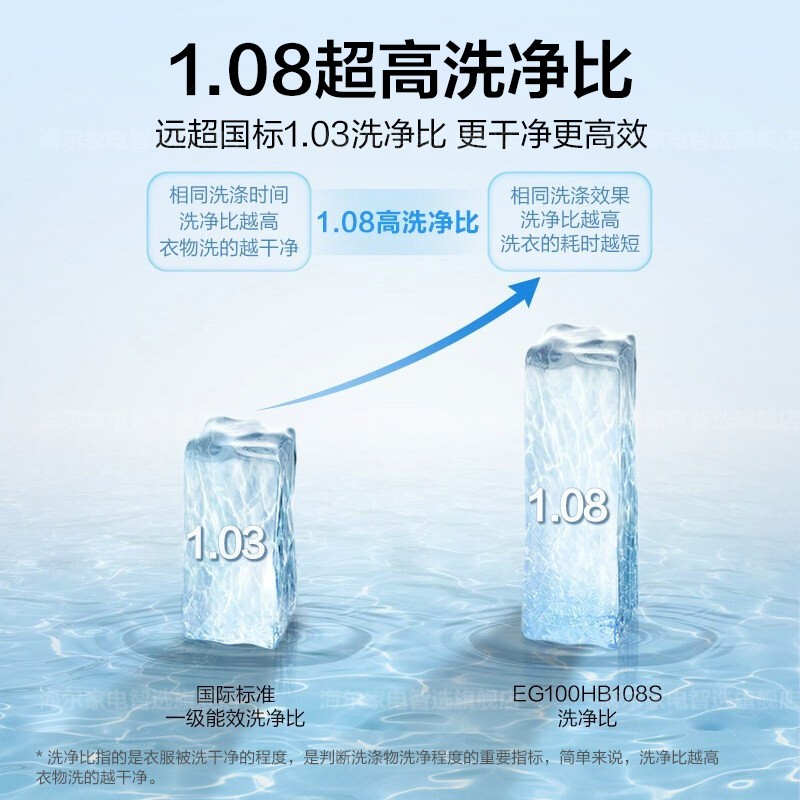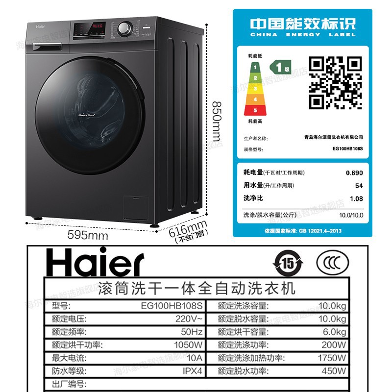 海尔 EG100HB108S 洗烘一体机,搭载BLDC变频电机,动力强劲、节能低噪,洗净比高达1.08。内置双喷淋,随漂随冲,减少视窗和窗垫的泡沫残留,避免藏污纳垢。内置蒸汽洗程序,可以无水护理高档衣物,快速除味除菌。支持65-85摄氏度变温烘干,16M/S热状态均匀风速高效烘干。内置NTC智能传感器,精准控温,1秒测温100次,JIT衣干即停,防止过度烘干。采用60摄氏度蒸汽深入纤维杀灭细菌,物理方式更安心。
