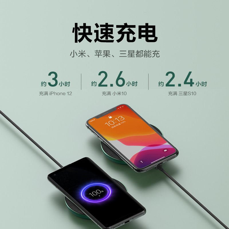 充电面板采用超纤面料,它具有耐磨性强、手感较好、柔软性佳的特性。好看又实用,瞬间提升桌面质感。无需数据线,可为智能设备提供10WMAX无线快充。只需轻轻一放,即刻为你的智能设备充电续航。兼容多种无线充电设备,不仅能为小米10、小米10Pro提供10W快充,还能为iphone11和三星S10提供快速充电。充电有效感应达4mm,,带売也能充。