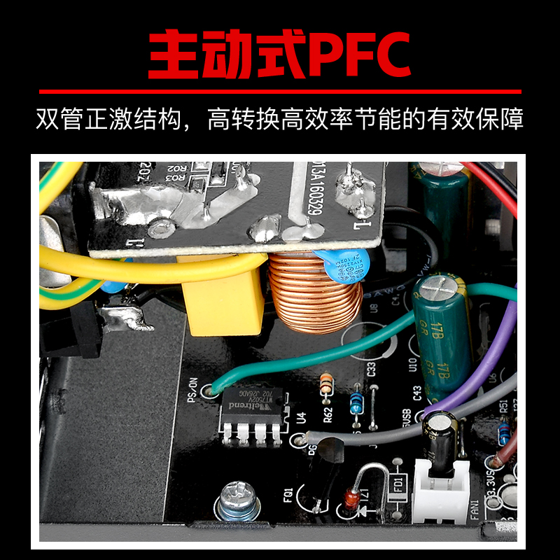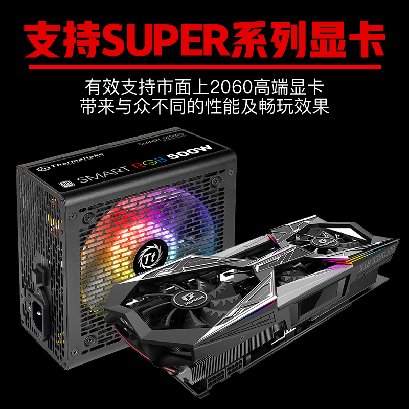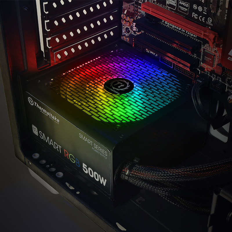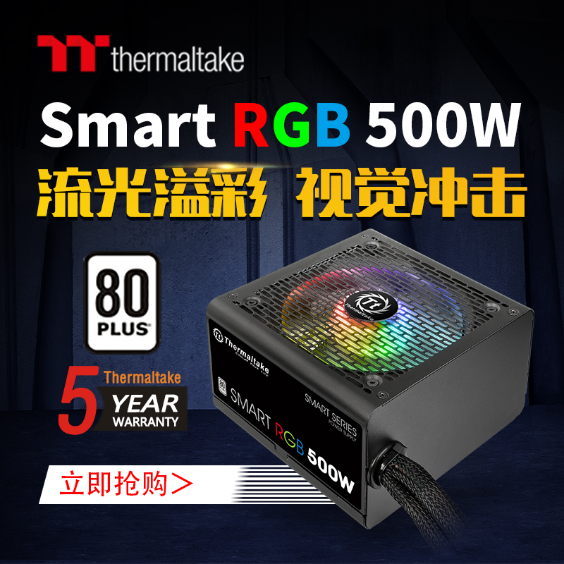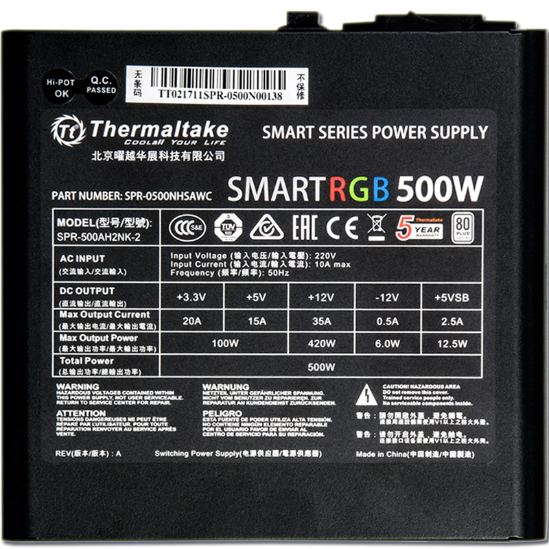 Tt Smart RGB电源,额定功率500W,采用双管正激结构,通过80PLUS白牌认证,预装一把120mm RGB风扇,单路12V设计,主动式PFC,电源尺寸为150x140x86mm,能够适配大部分机箱,五年质保。
