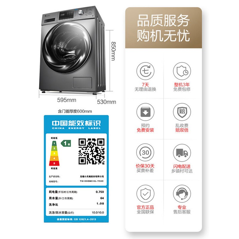 小天鹅(LittleSwan)这款型号为TG100EM01G-Y50C的滚筒洗衣机,其属于高端水魔方系列,产品洗涤容量10公斤,特有水魔方冷水洗涤不加热,通过三大水流有序而强劲的洗涤深层瓦解污渍,保证衣服鲜亮无褪色,呵护纤维平整无受损。3D立方内筒搭配魔力提升筋,模拟搓衣板摔打污渍,深层瓦解污渍,净衣更护。纳米银离子除菌,提升筋的银离子遇水缓释,在衣物和洗衣机内筒形成保护膜抑制细菌滋生,99%除菌率,安全健康。 搭载BLDC变频电机,1400高转速,内设不平衡自矫正系统,减少洗衣过程抖动;16种洗涤模式,包括羽绒服洗、羊毛洗等,智能洗可根据衣物重量智能调节洗衣进程;支持95℃筒自洁;门圈采用抗菌材质,内筒带照明灯;洗净比1.08。