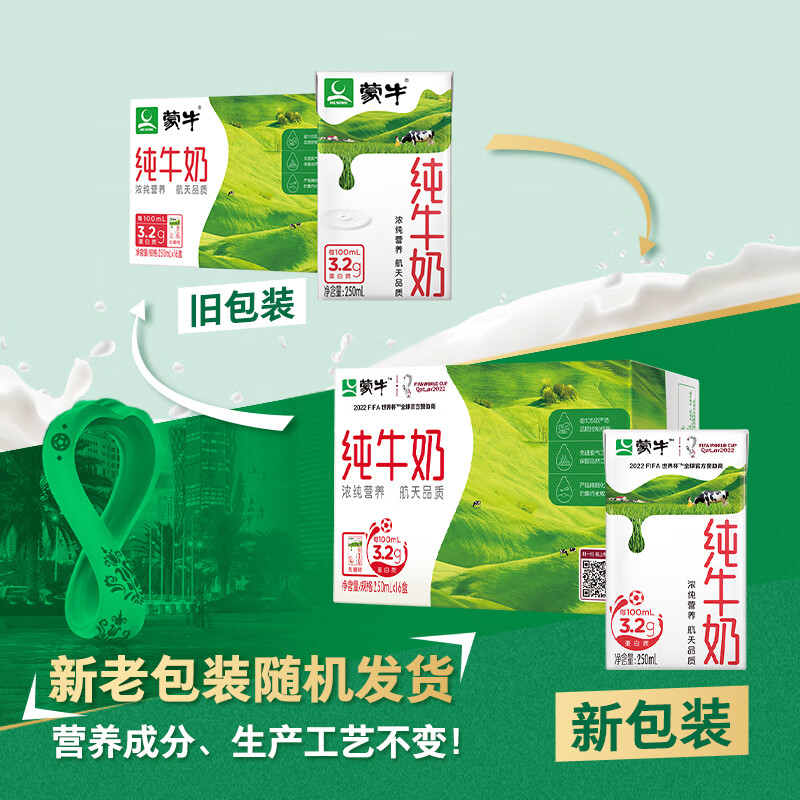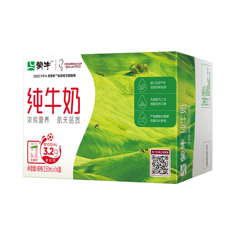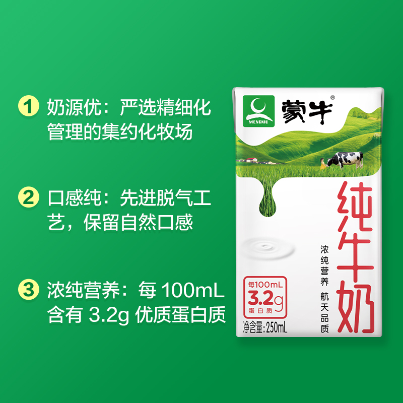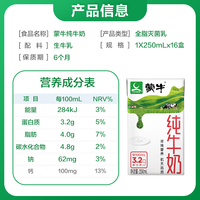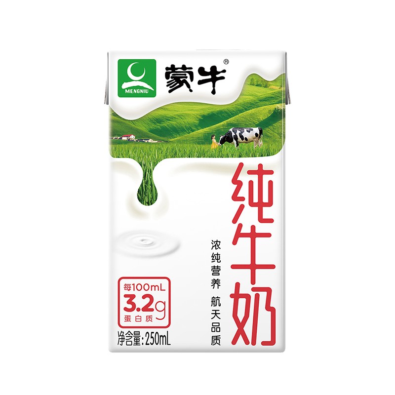 蒙牛乳业(集团)股份有限公司(简称蒙牛乳业或蒙牛),成立于1999年8月。蒙牛乳业成立以来,拥有特仑苏、纯甄、优益C、未来星、冠益乳、酸酸乳等产品。这款纯牛奶,助力航天,生牛乳全程冷链,香浓口感。规格:250ml*16盒。