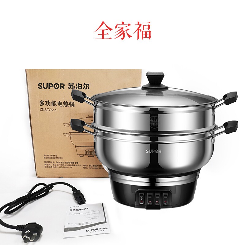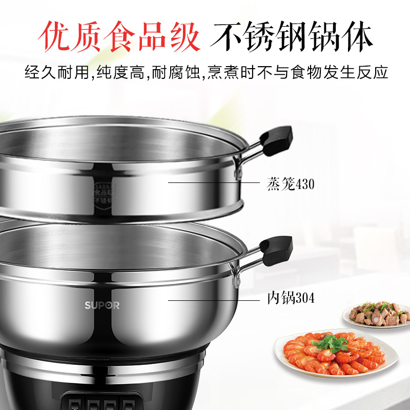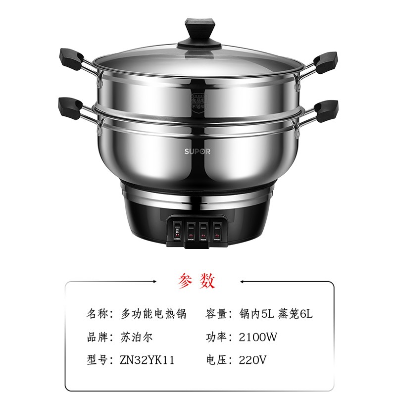 这款苏泊尔多功能电火锅,多功能的设计,可以用来蒸、煮、焖、炖、涮等,实用性强。加厚的设计,纯度高,耐腐蚀。烹煮时更好接触食物,真正做到快速出蒸汽。304不锈钢材质,经久耐用。11L的容量,满足一家人的使用需求。